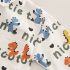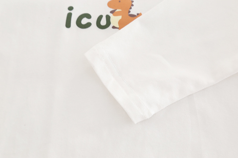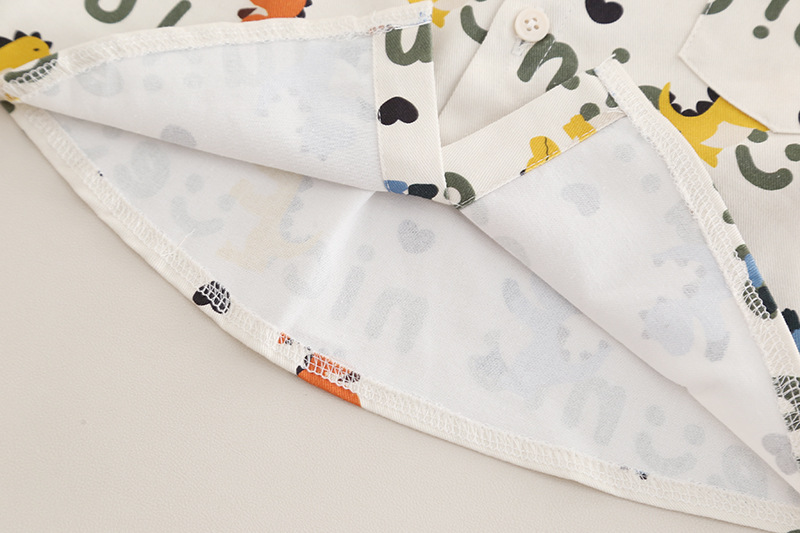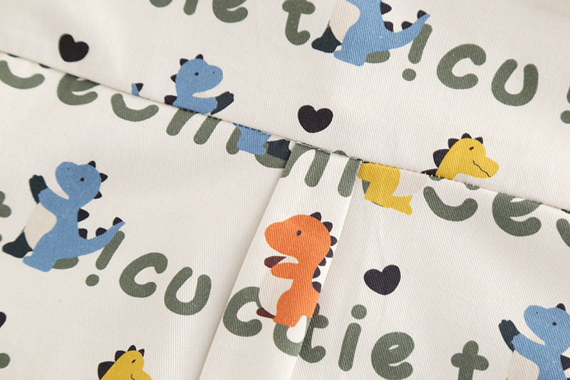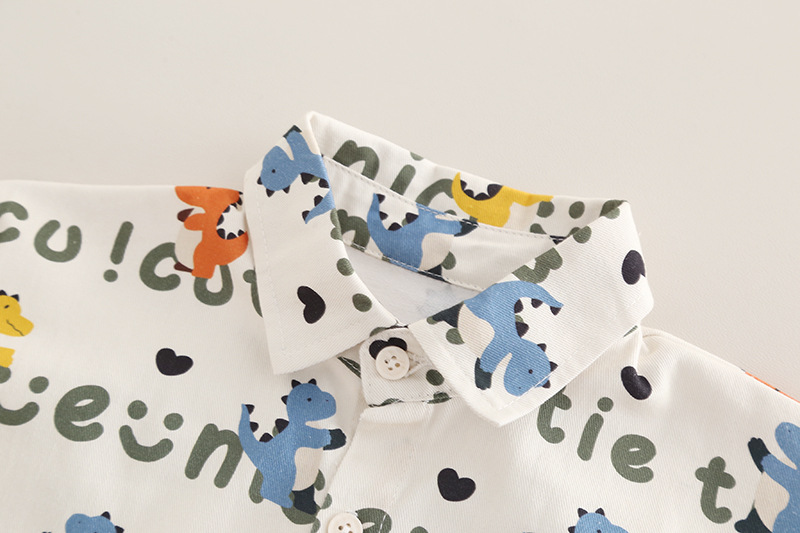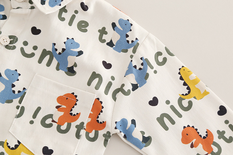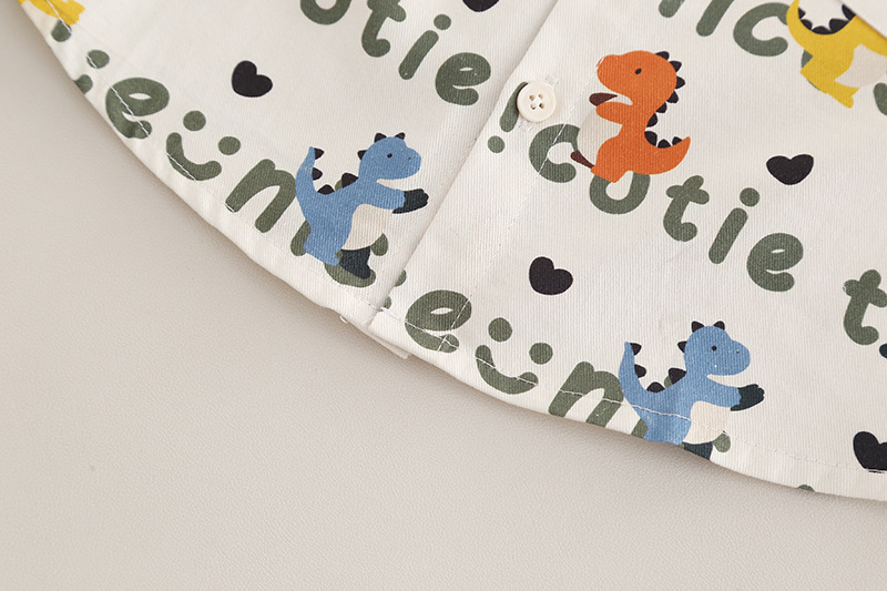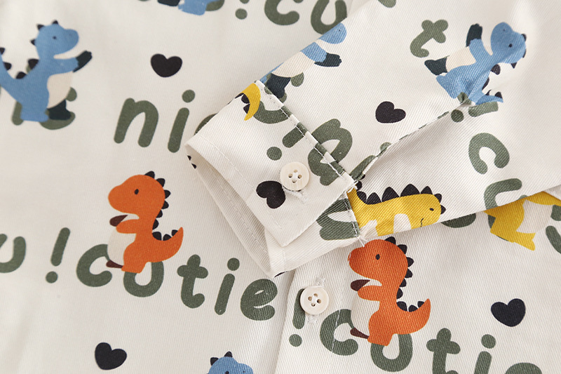 – Cămașă cu mânecă lungă, din bumbac, crem, decorată cu imprimeu all-over cu dinozauri colorați. Guler clasic, nasturi pe toată lungimea frontală și buzunar la piept.