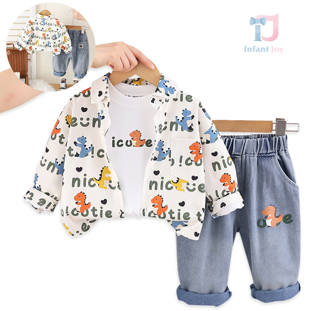 Set de 3 piese cu cămașă cu imprimeu de efect, bluză și pantaloni din denim Nice Dinos