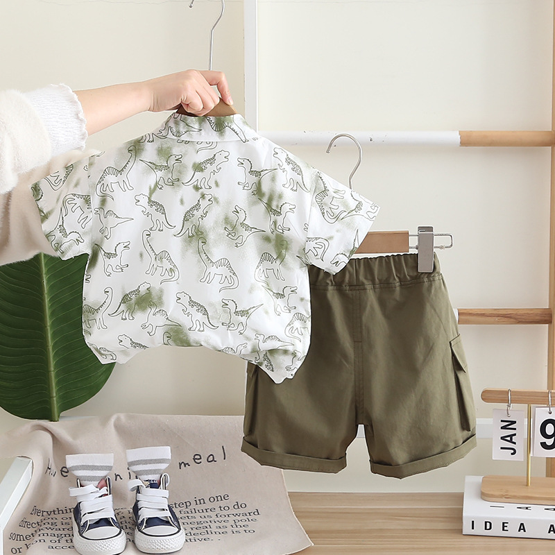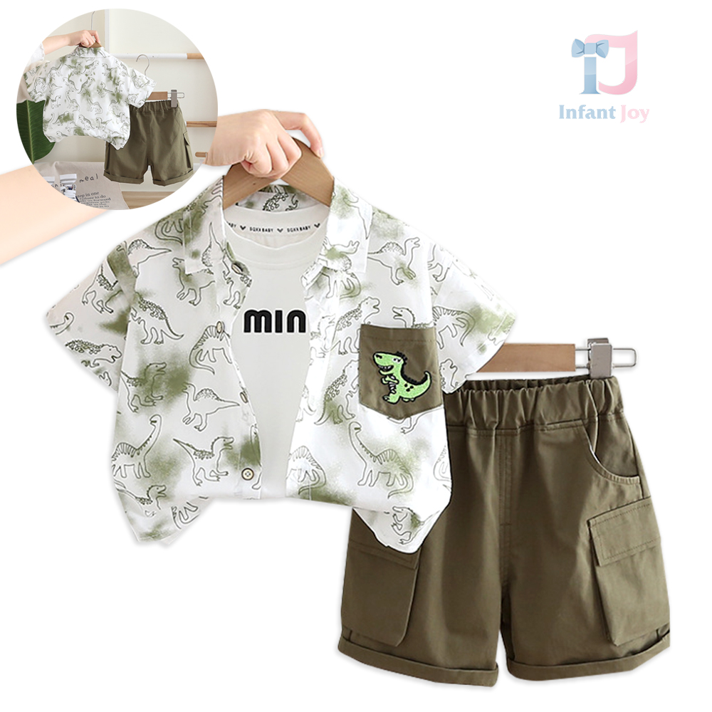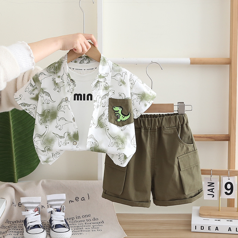 Set de 3 piese cu cămașă cu imprimeu dinozauri și efect stropit, maiou și pantaloni cargo scurți Jurassic Explorer