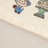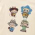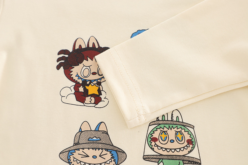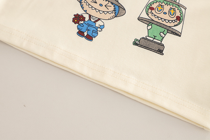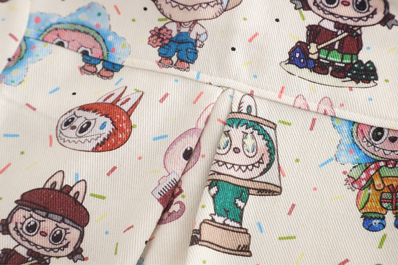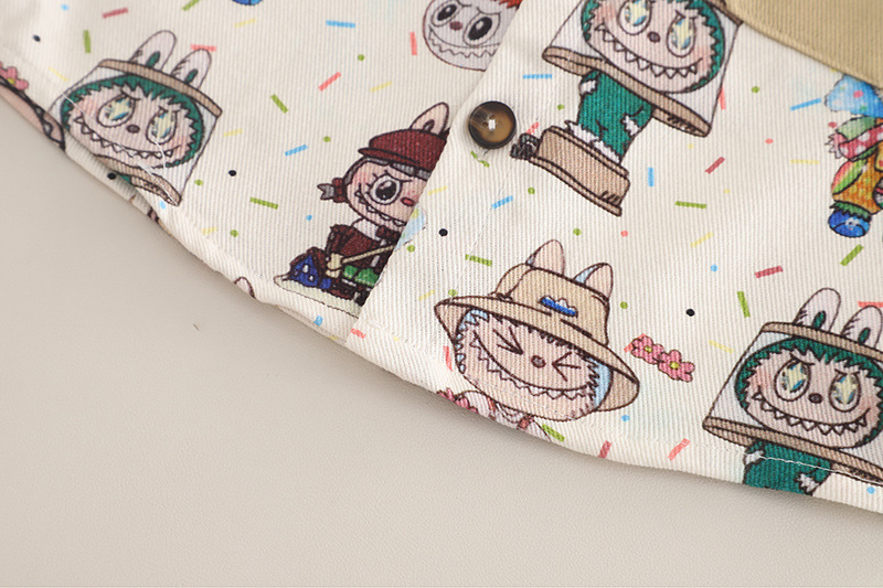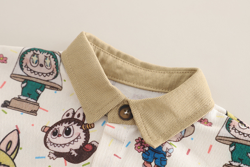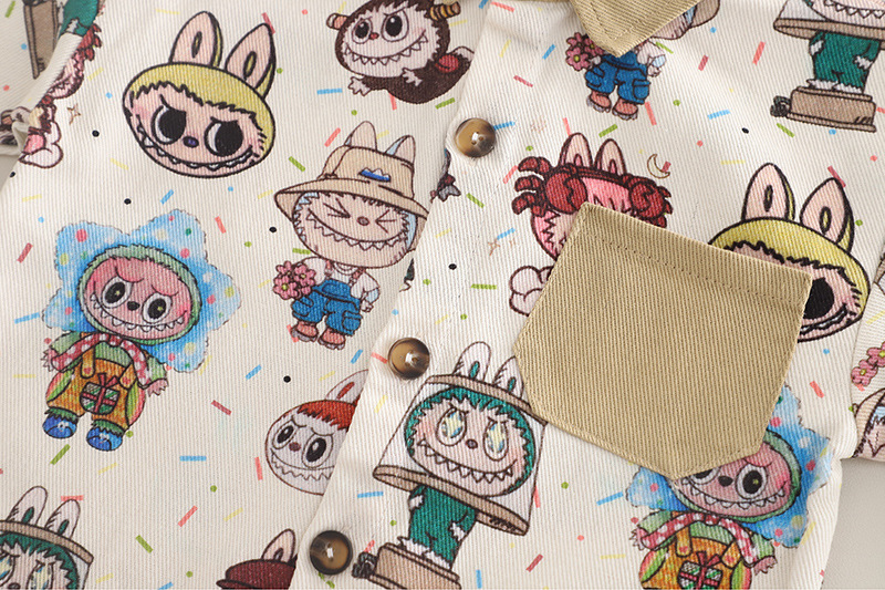 – Cămașă cu imprimeu colorat, pe bază crem, decorată cu personaje animate în costume. Model cu guler clasic și buzunar bej contrastant cu textură asemănătoare catifelei. Designul combină stil retro cu accente moderne.