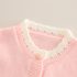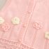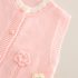 – Cardigan tricotat, confecționat dintr-un tricot moale și călduros, de culoare roz deschis. Este decorat cu frumoase floricele tricotate 3D în roz și ecru, care adaugă un aspect jucăuș și artistic. Se închide în față cu mici nasturi albi. Marginea și gulerul sunt tricotate în maro contrastant, pentru un finisaj elegant.