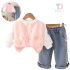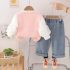 Set de 3 piese cu cardigan cu flori 3D, bluză cu mâneci bufante și pantaloni din denim cu fundițe Blossom Aura