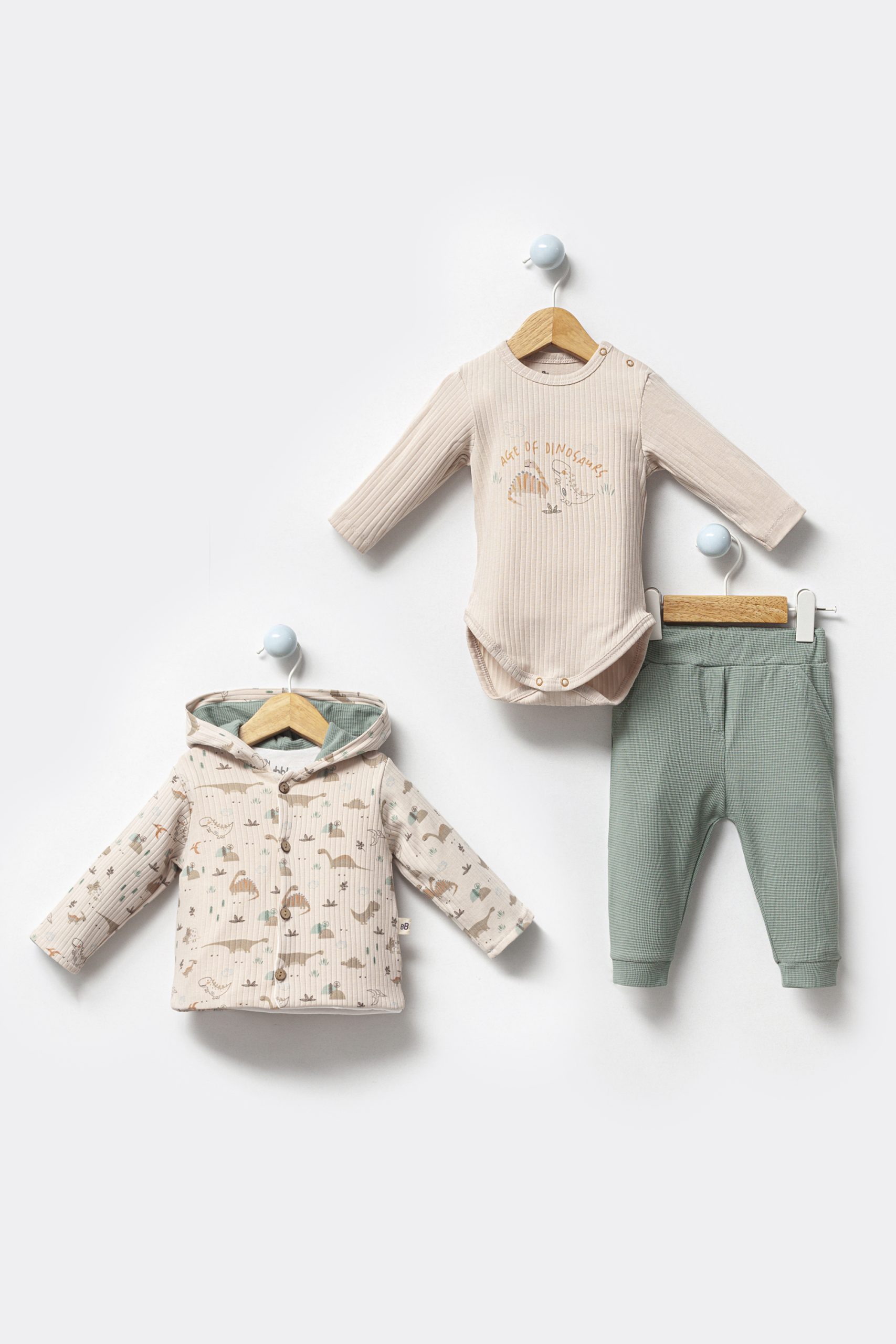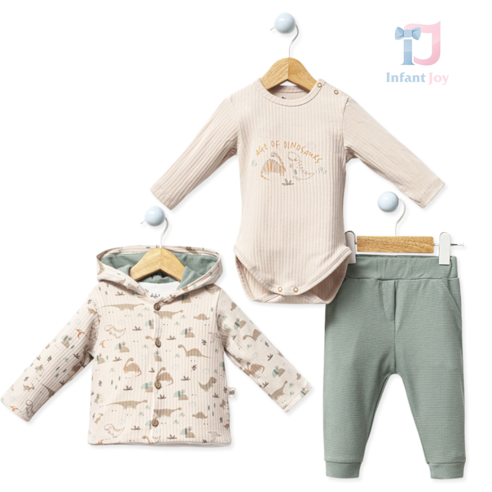 Set de 3 piese cu cardigan cu glugă și body din bumbac + pantaloni cu efect waffle Tiny T-Rex