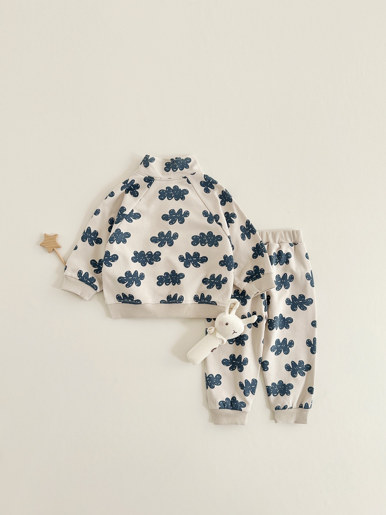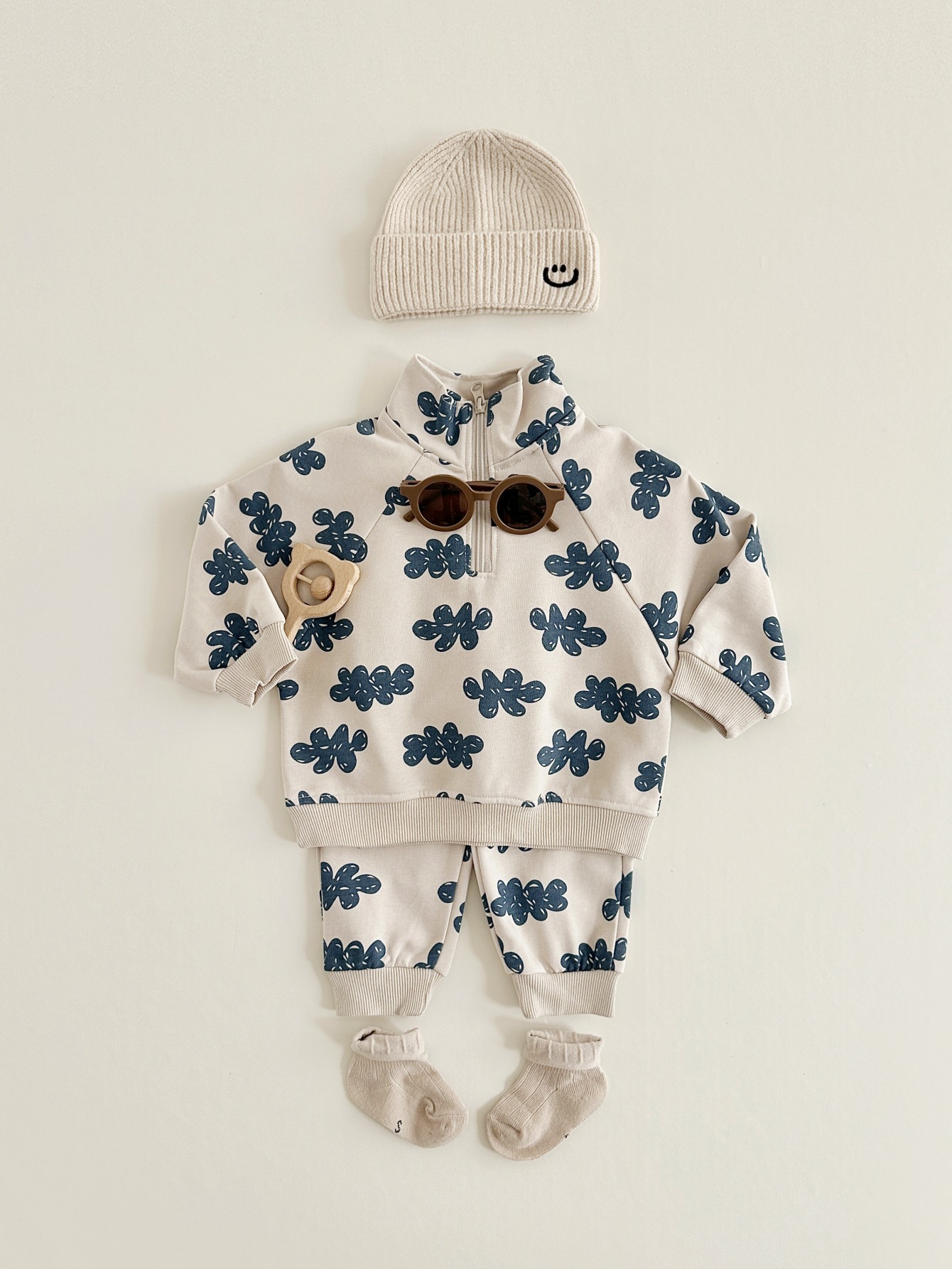 -Hanorac din material moale și de înaltă calitate din bumbac, cu un model bej-crem. Imprimeu atrăgător cu forme de norișori în culoare albastru închis, guler înalt cu fermoar elastic pentru îmbrăcare ușoară și protecție suplimentară împotriva frigului. Manșete elastice la mâneci și talie pentru o potrivire confortabilă.