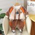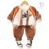 – Jachetă tip bomber cu capse și panouri colorate în contraste de bej, ciocolatiu și portocaliu. Confecționată din bumbac moale și rezistent, cu o ușoară elasticitate, are rips sport la guler și la manșete, precum și o emblemă brodată amuzantă.