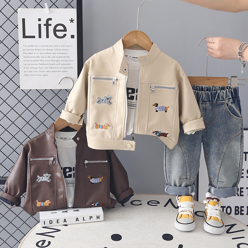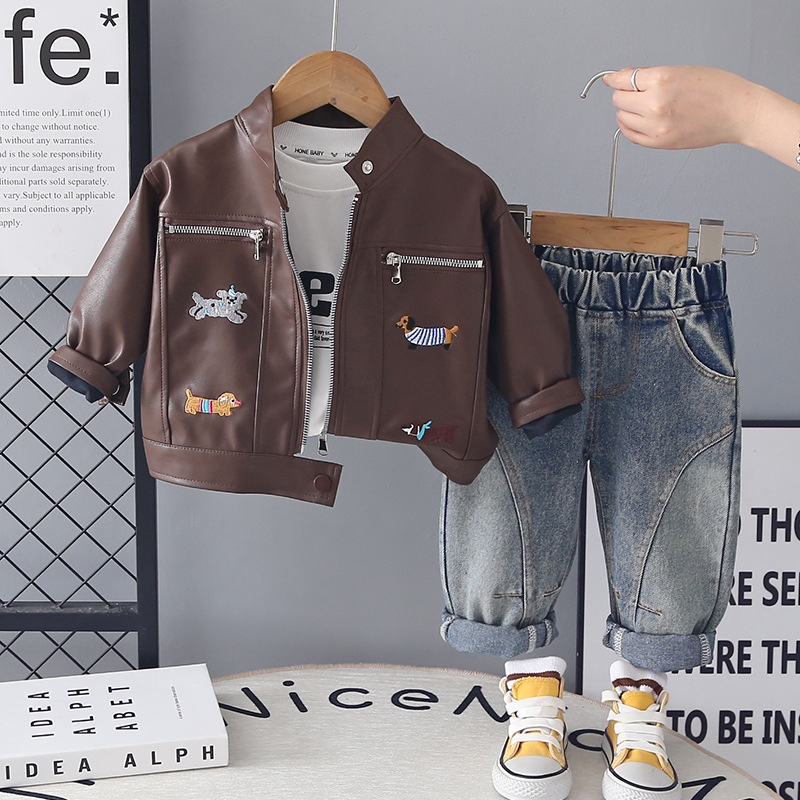 Set de 3 piese cu jachetă brodată din piele ecologică, bluză și pantaloni din denim Fashion Dogs