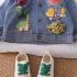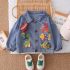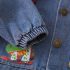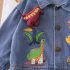 – Geacă din denim cu guler clasic și croială lejeră. Accentul principal sunt imprimeurile colorate și aplicațiile cu dinozauri – inclusiv elemente 3D ridicate, precum aripioare și spini, care adaugă volum jucăuș; se închide cu nasturi metalici, iar mânecile sunt ușor adunate cu elastic pentru confort sporit.