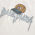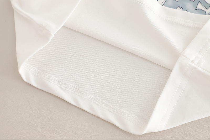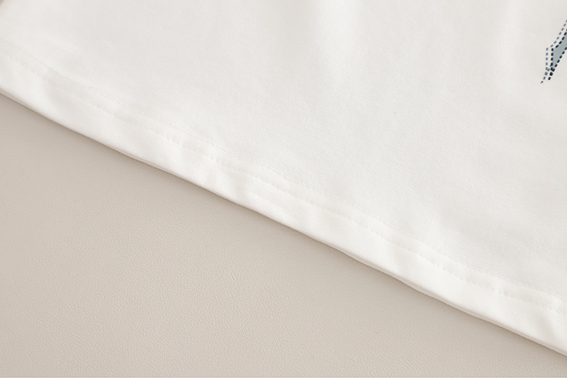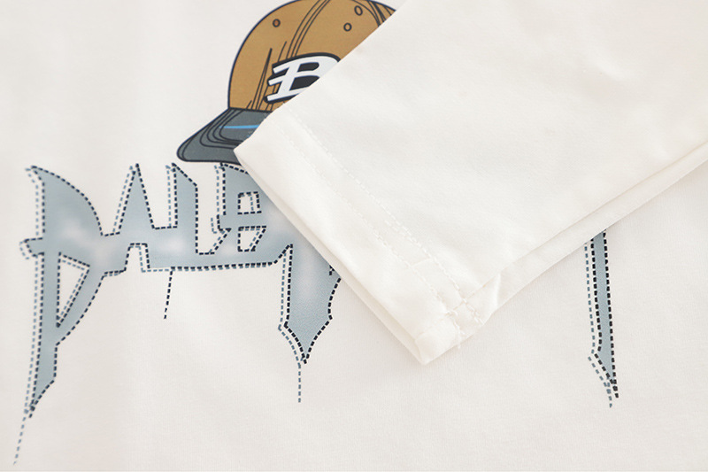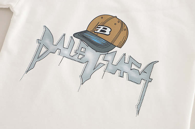 – Bluză albă din bumbac cu guler rotund și imprimeu stilizat cu o șapcă de baseball – un accent jucăuș care completează tematica urbană.