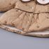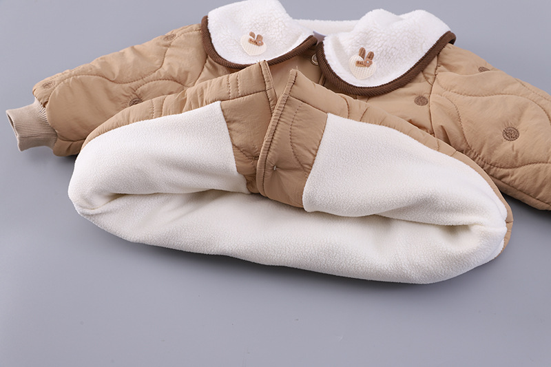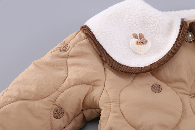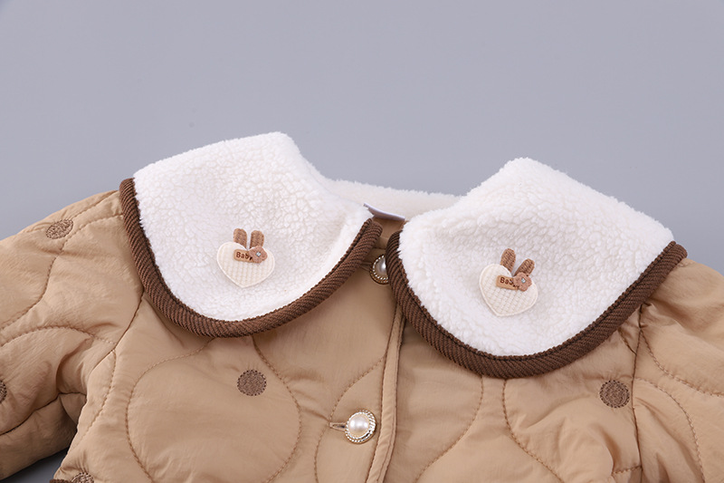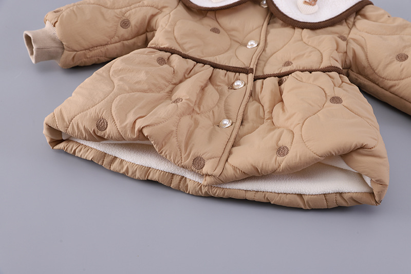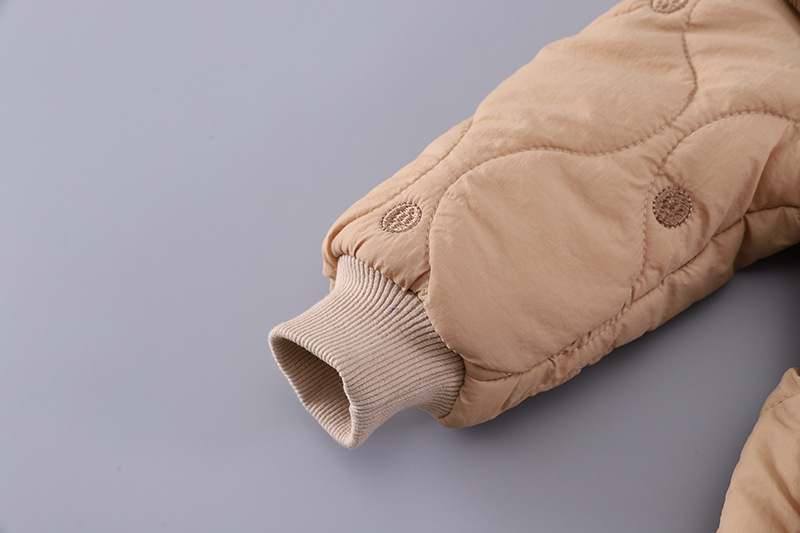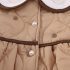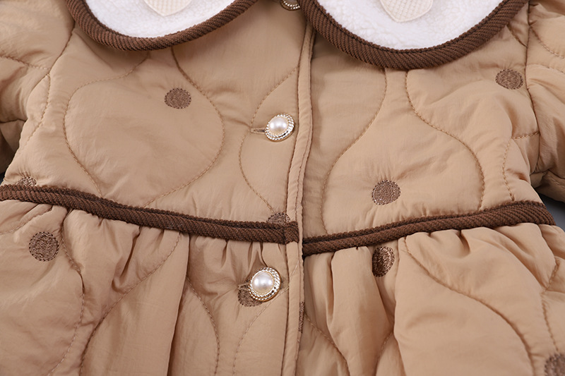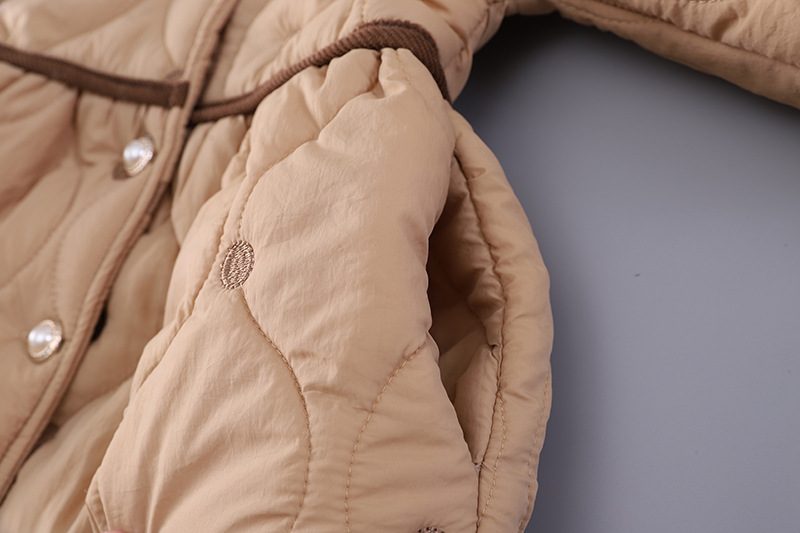 – Parka matlasată cu guler tip „Peter Pan”, confecționată din material de tip șușlău de înaltă calitate, în culoare bej. Modelul are o textură capitonată frumoasă și accente brodate delicate. Gulerul este contrastant și plușat, oferind un aspect retro și extrem de delicat. Se închide cu nasturi în față, are o ușoară cambrură în talie și manșete elastice la mâneci pentru un confort sporit și protecție împotriva frigului.