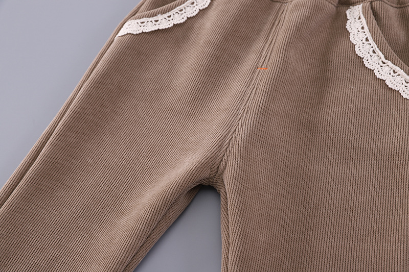 – Pantalon din denim în ton maro, cu talie elastică pentru o îmbrăcare ușoară și confort la mișcare. Modelul este împodobit cu accente fine din dantelă și aplicații florale în partea de jos, care oferă un aspect complet și feminin.