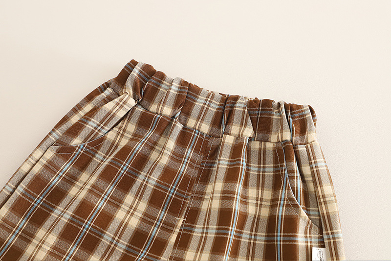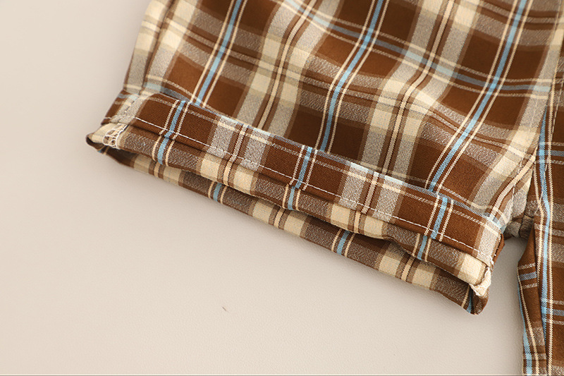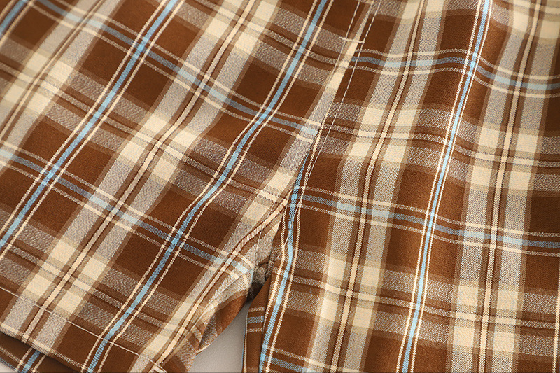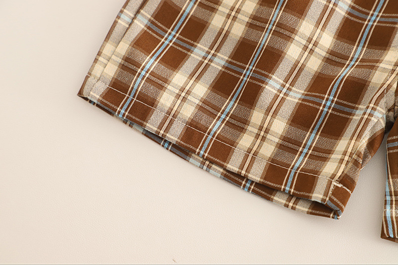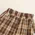 -Pantaloni scurți, model clasic cu două buzunare și talie elastică pentru confort, cu un imprimeu în carouri din gama de maro, perfect asortat cu bluza