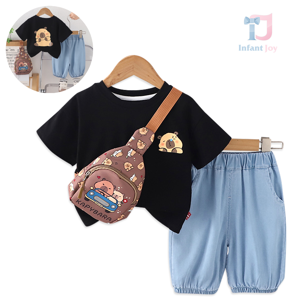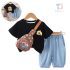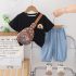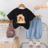 Set de 3 piese cu tricou cu imprimeu, pantaloni scurți din denim și borsetă de umărWanderBear Black