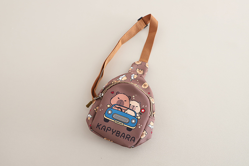 – Geantă de umăr în maro ciocolată, cu imprimeu cu o capibară într-o mașină și inscripția “KAPYBARA”. Se închide cu fermoar și are bretea reglabilă pentru confort.