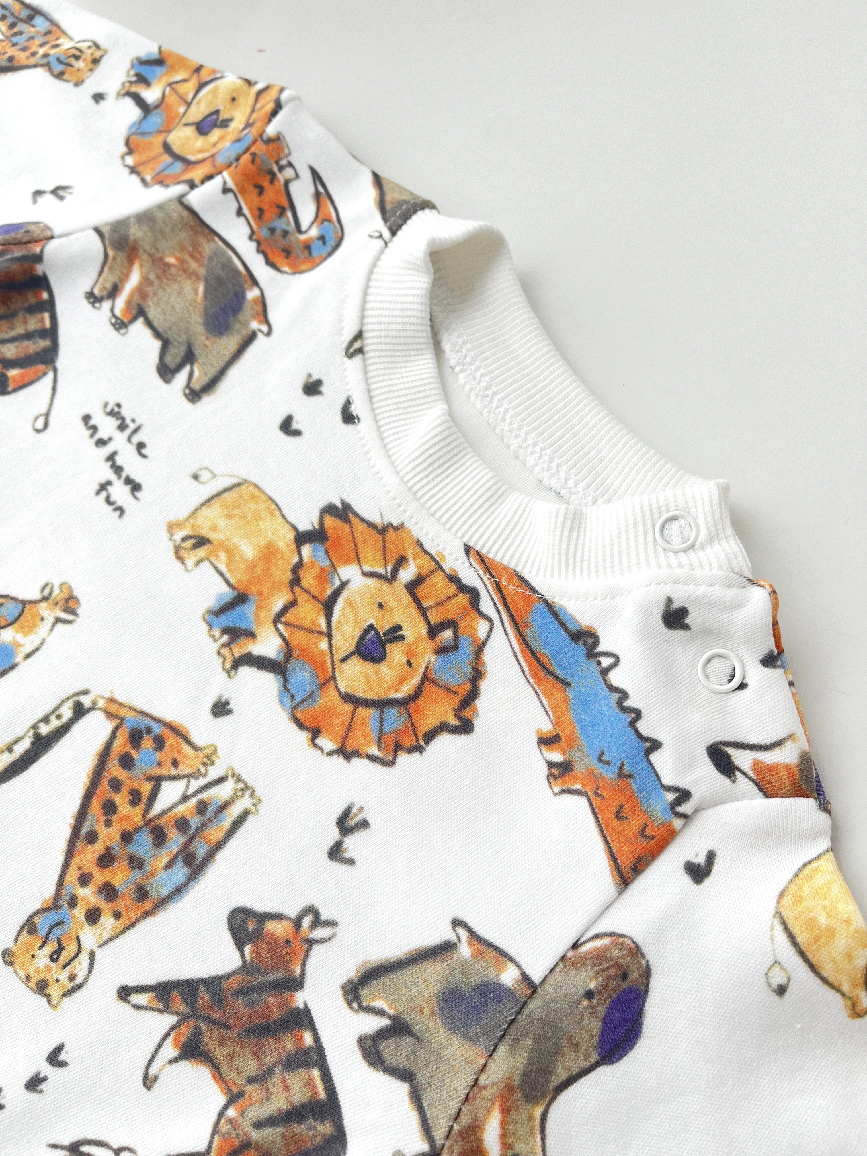 -Bluziță/sweatshirt din bumbac alb, cu mâneci lungi și imprimeu vesel cu animale – girafe, lei și elefanți. Prevăzută cu manșete elastice reiate pentru confort.