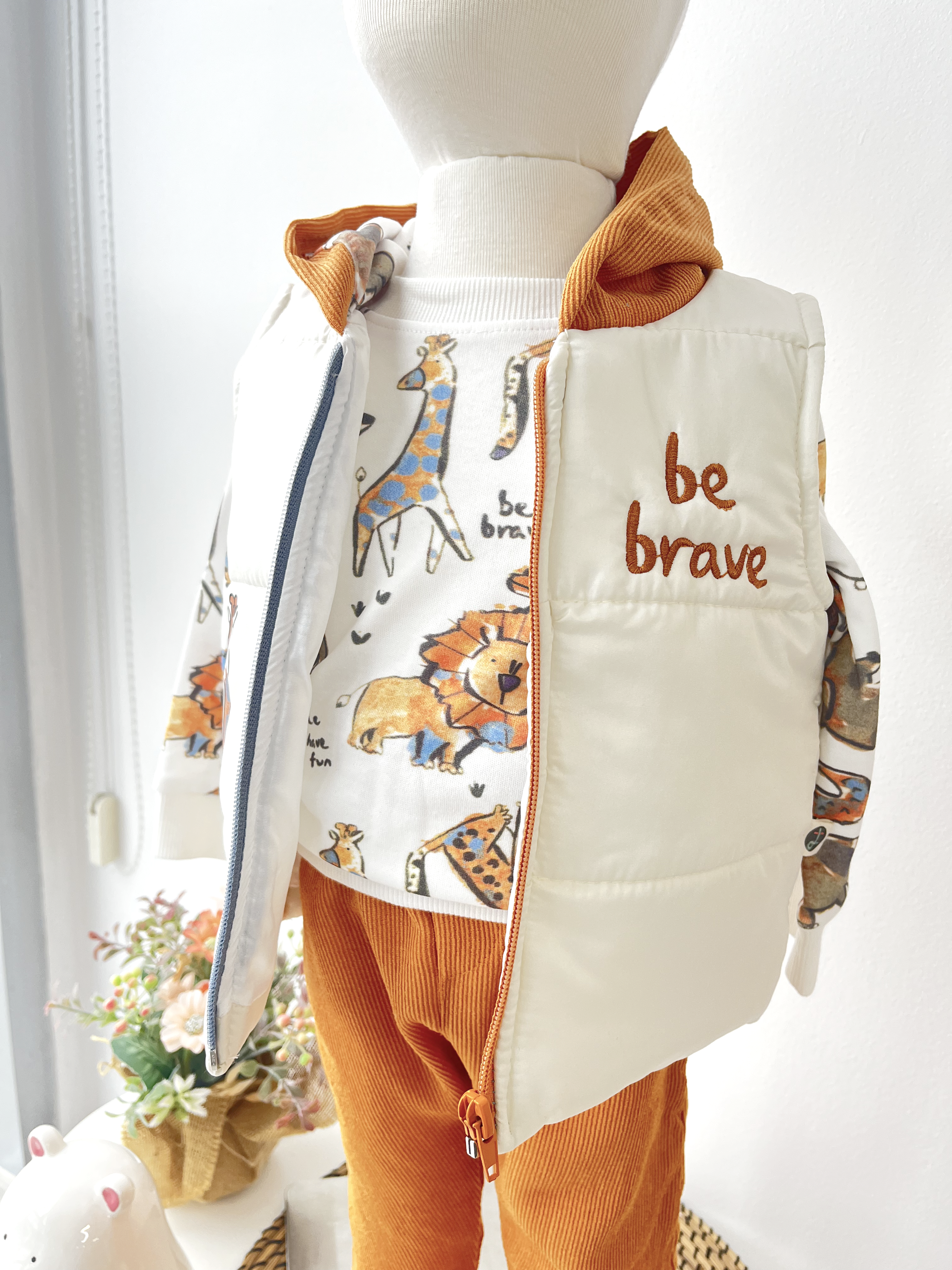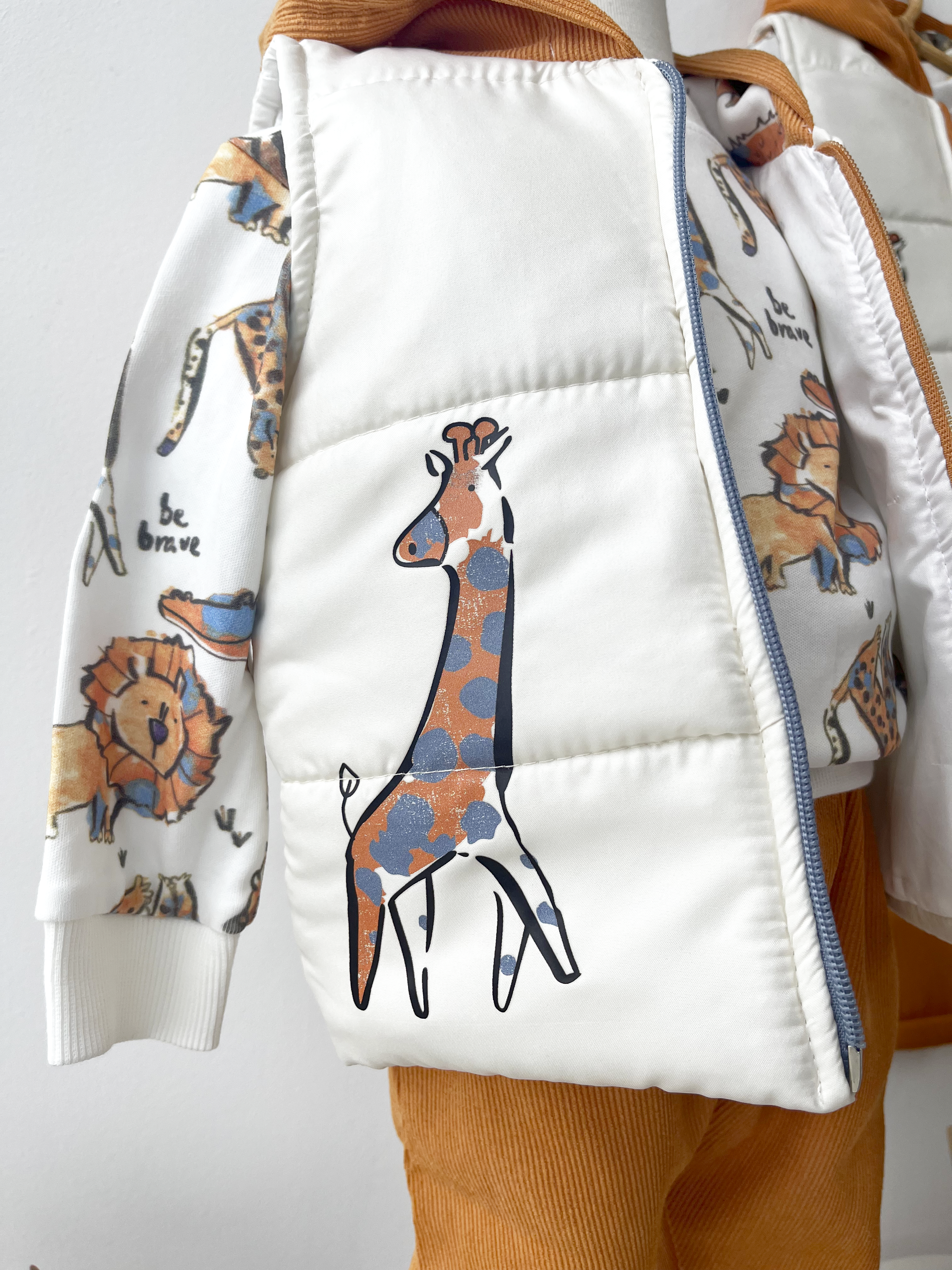 -Vestă realizată din material fâș de înaltă calitate, în culoare albă, prevăzută cu glugă într-o nuanță de muștar cu efect reliefat. Modelul este decorat cu broderie „be brave“ și un imprimeu haios reprezentând o girafă. Se închide cu fermoar pentru îmbrăcare rapidă și comodă.