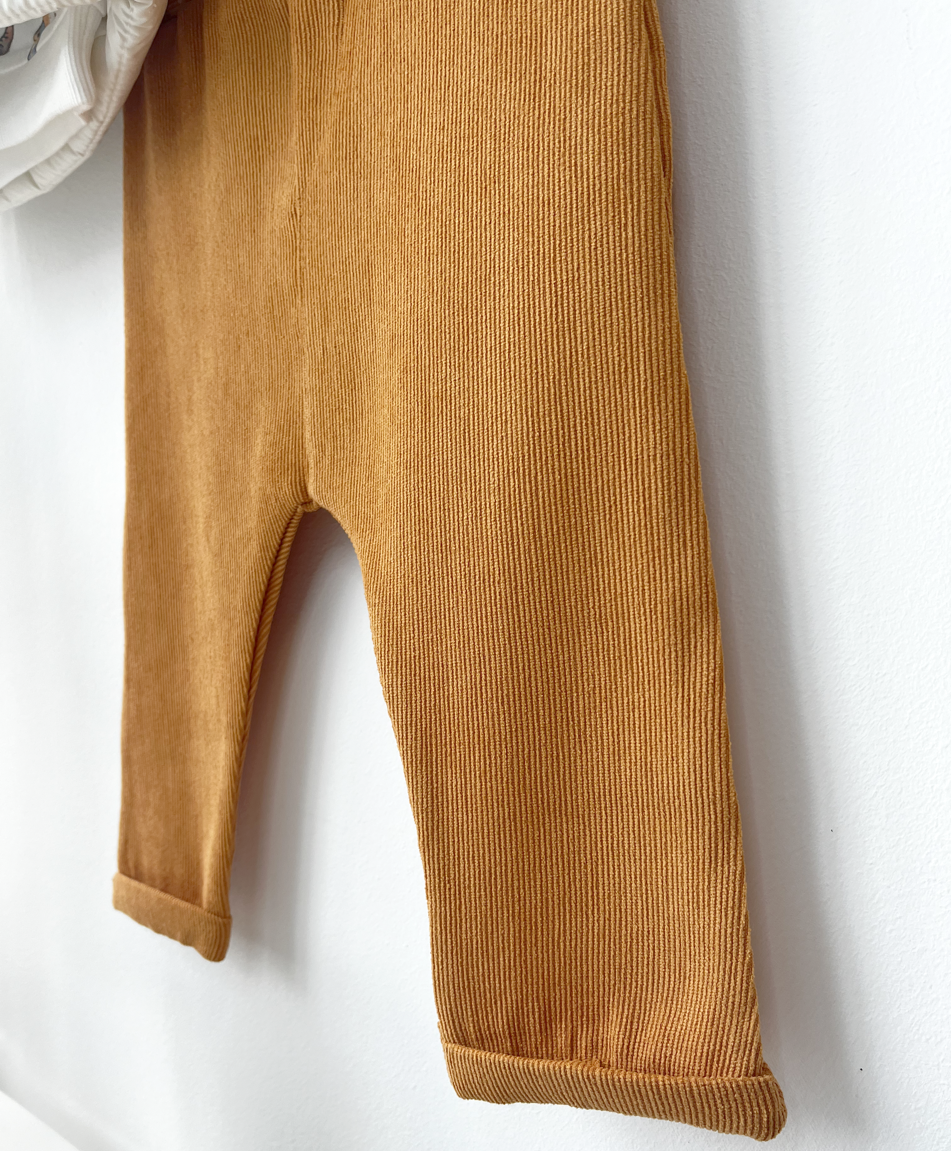 -Pantaloni reliefați într-o nuanță muștar, cu talie elastică pentru confort la purtare.