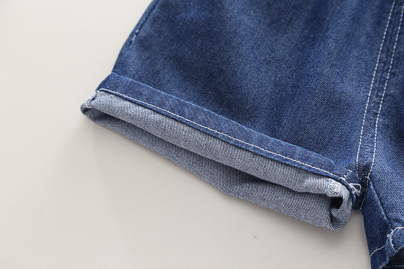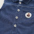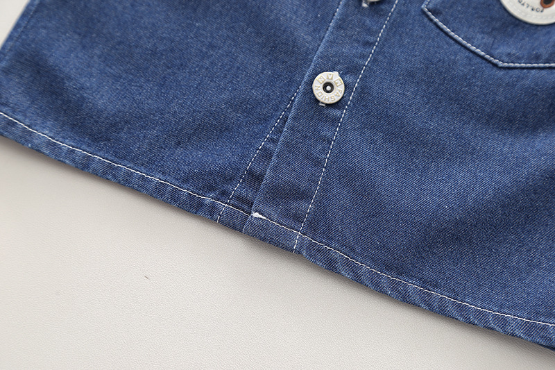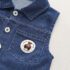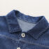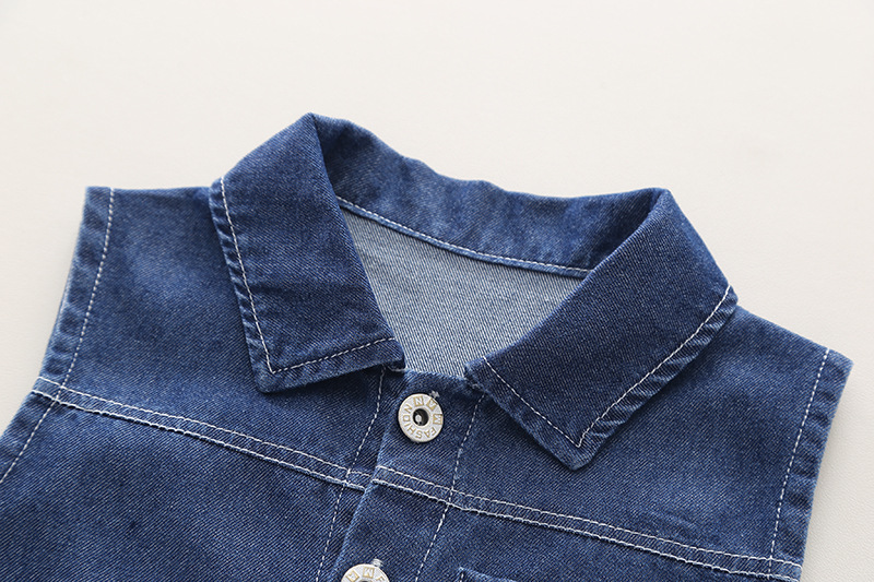 – Vestă din denim, culoare albastru intens, cu guler clasic, nasturi metalici și buzunar pe partea stângă cu emblemă ca accent.