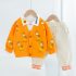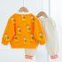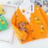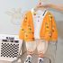 – Jachetă din tricot subțire, portocaliu intens, cu imprimeuri haioase de girafe și ursuleți. Model cu închidere frontală completă cu nasturi.
