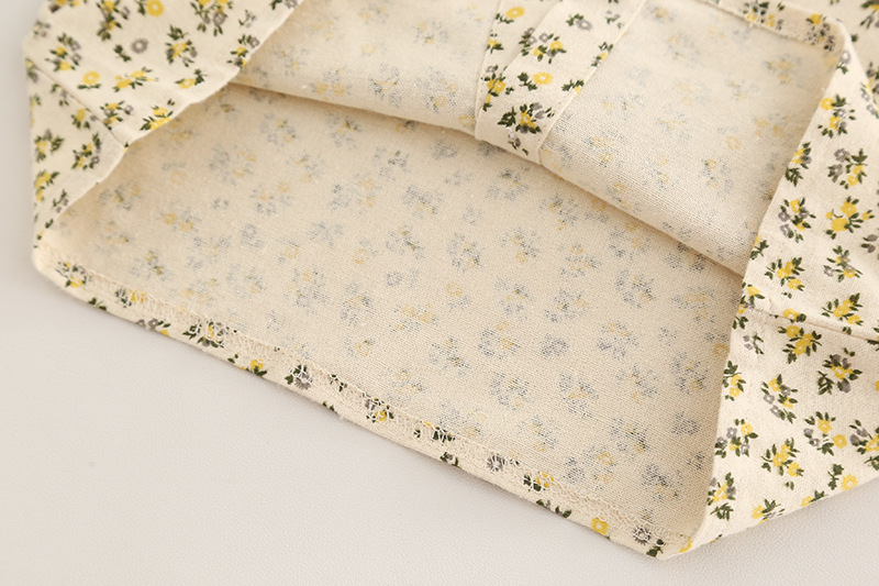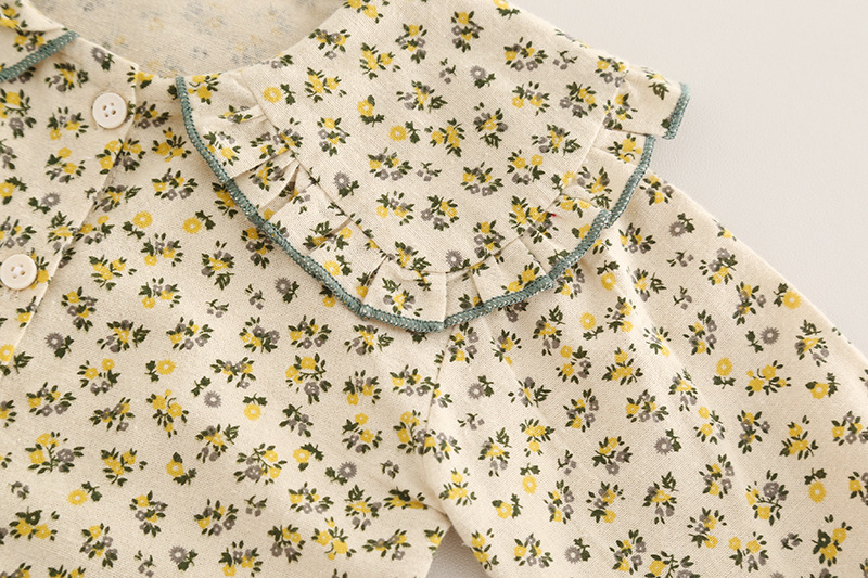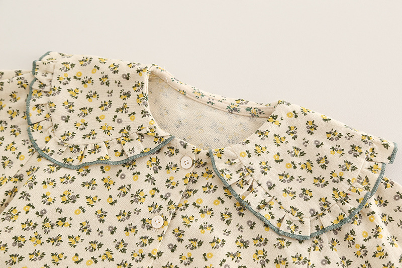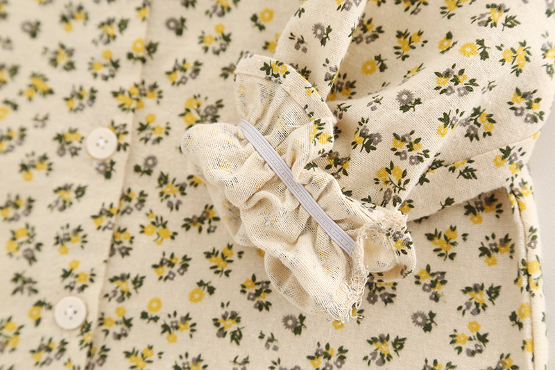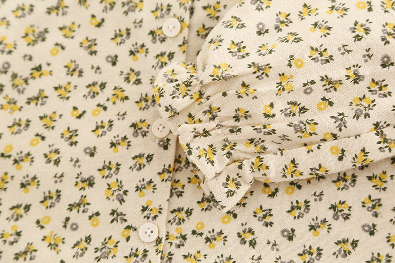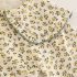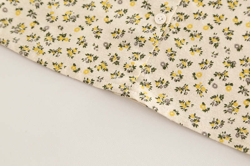 – Cămașă din bumbac cu imprimeu floral, pe fundal crem, decorată cu flori mici galben-verzui. Gulerul tip „Peter Pan” este accentuat cu volănașe și tiv contrastant, iar mânecile ușor încrețite cu elastic adaugă un plus de delicatețe.