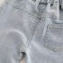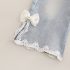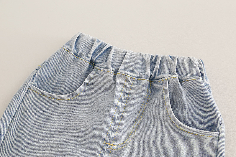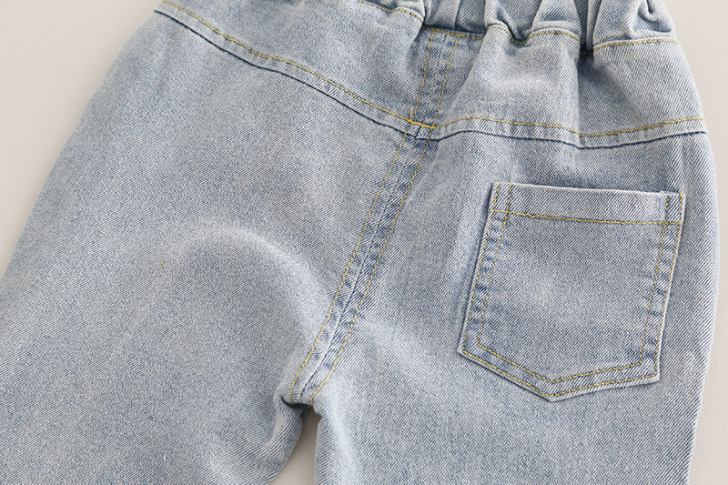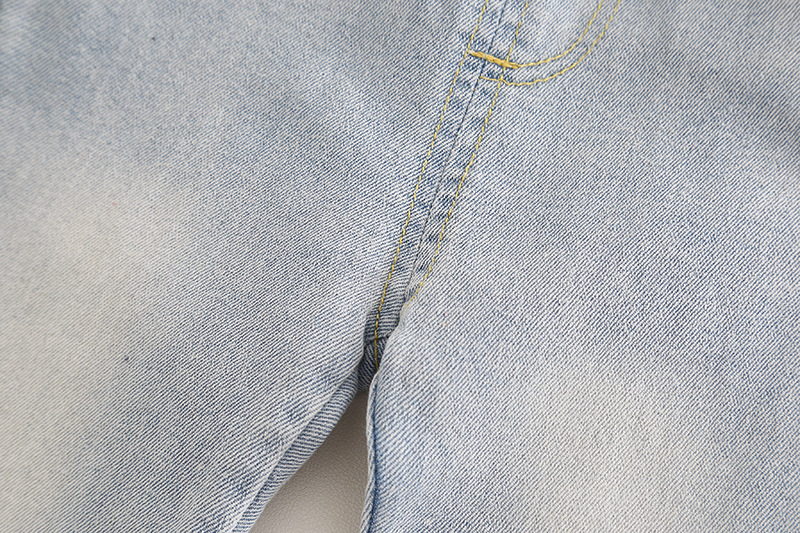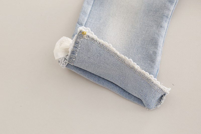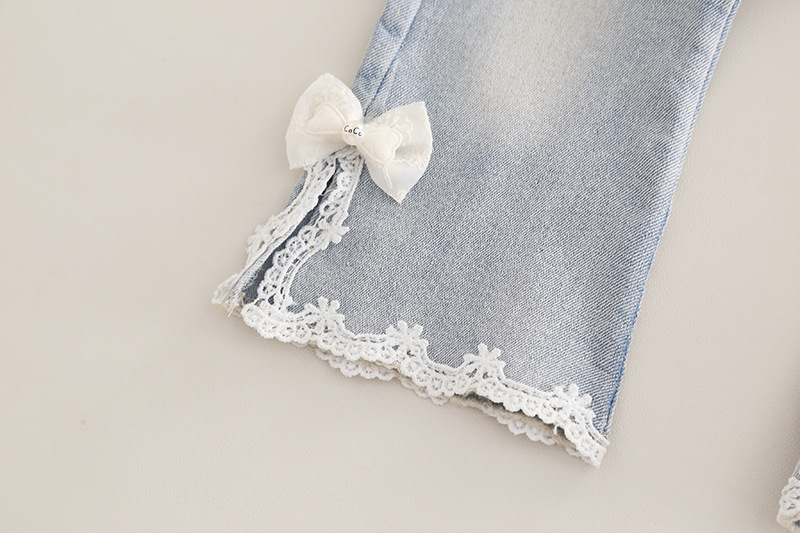 – Pantaloni din denim, într-o nuanță deschisă de albastru, cu croială dreaptă, aplicații din dantelă și fundițe fine la tivul cracilor. Talia elastică și lungimea practică îi fac ideali pentru ținute de primăvară cu teniși sau balerini.
