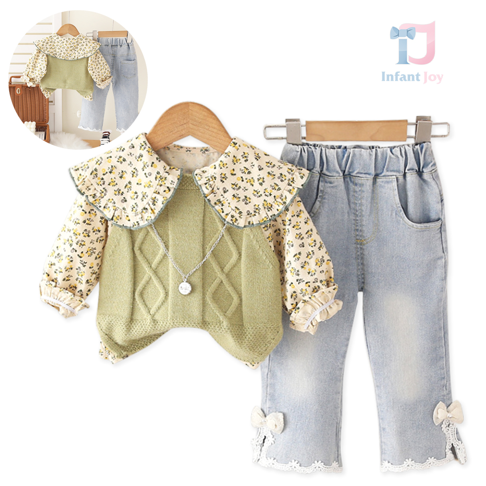 Set de 3 piese cu vestă tricotată, cămașă colorată și pantaloni din denim cu elemente 3D Garden Stroll