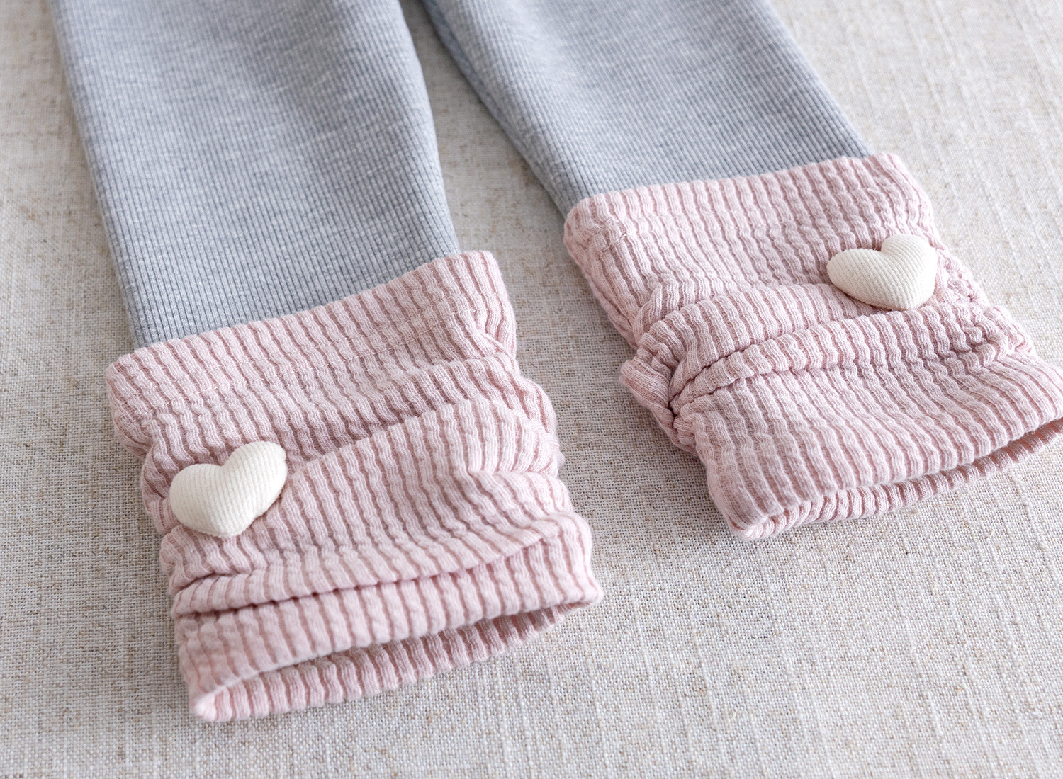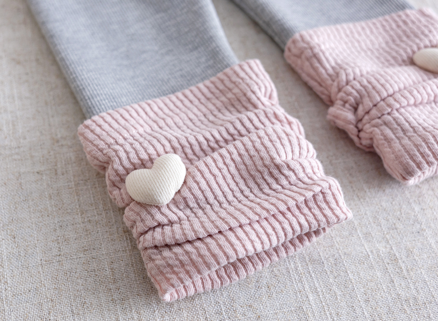 – Colanți reiat – model comod și elastic, cu strat interior călduros, care se mulează bine pe corp fără a restricționa mișcările. Potriviți pentru activitățile zilnice și confort pe tot parcursul zilei. Accentul modelului sunt jambușii cusuți – moi și eleganți, într-o nuanță delicată de roz, cu textură în relief și inimioare 3D decorative, care adaugă un plus de finețe și romantism ținutei.