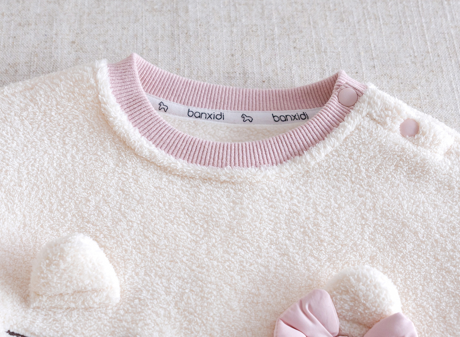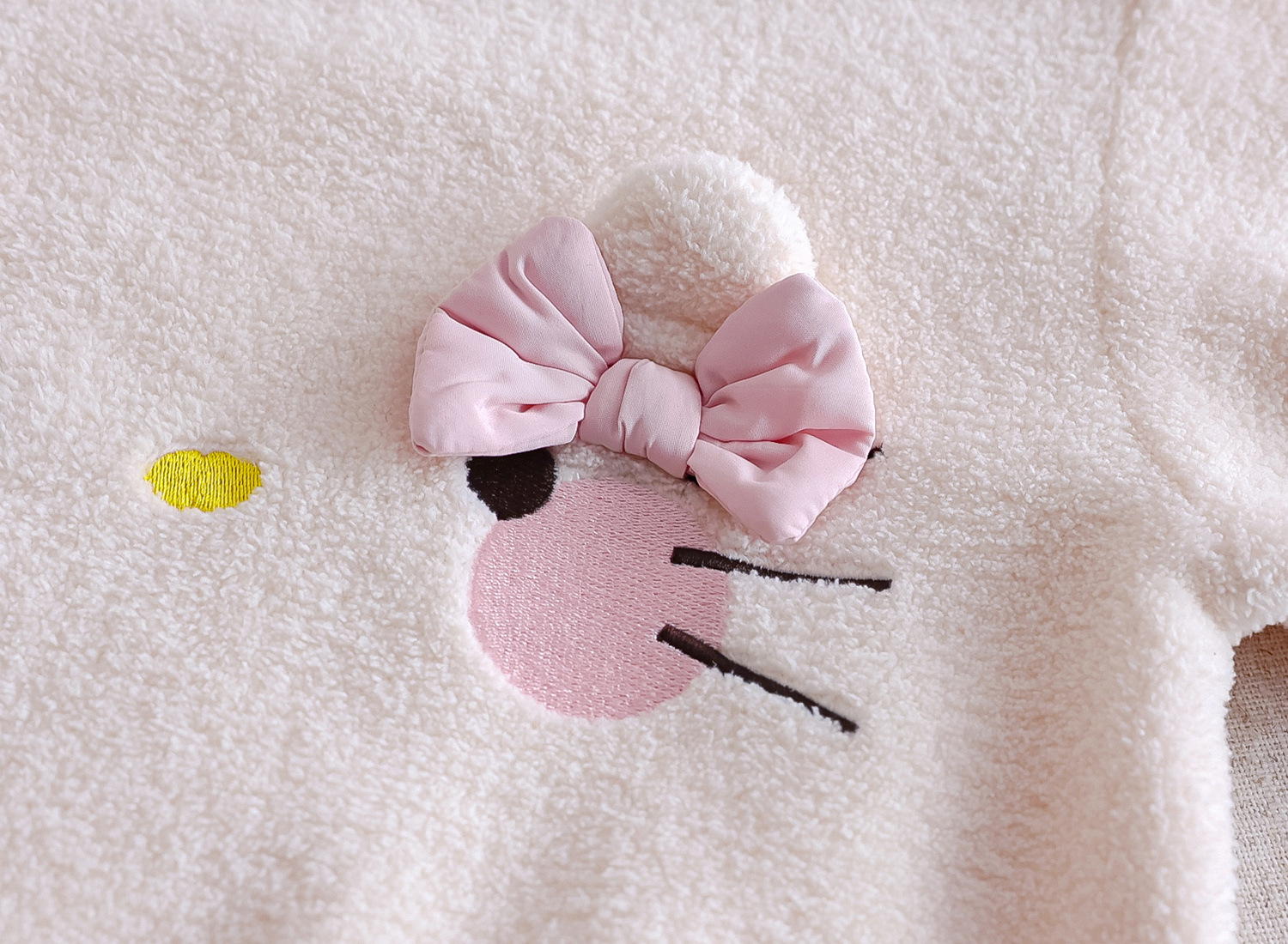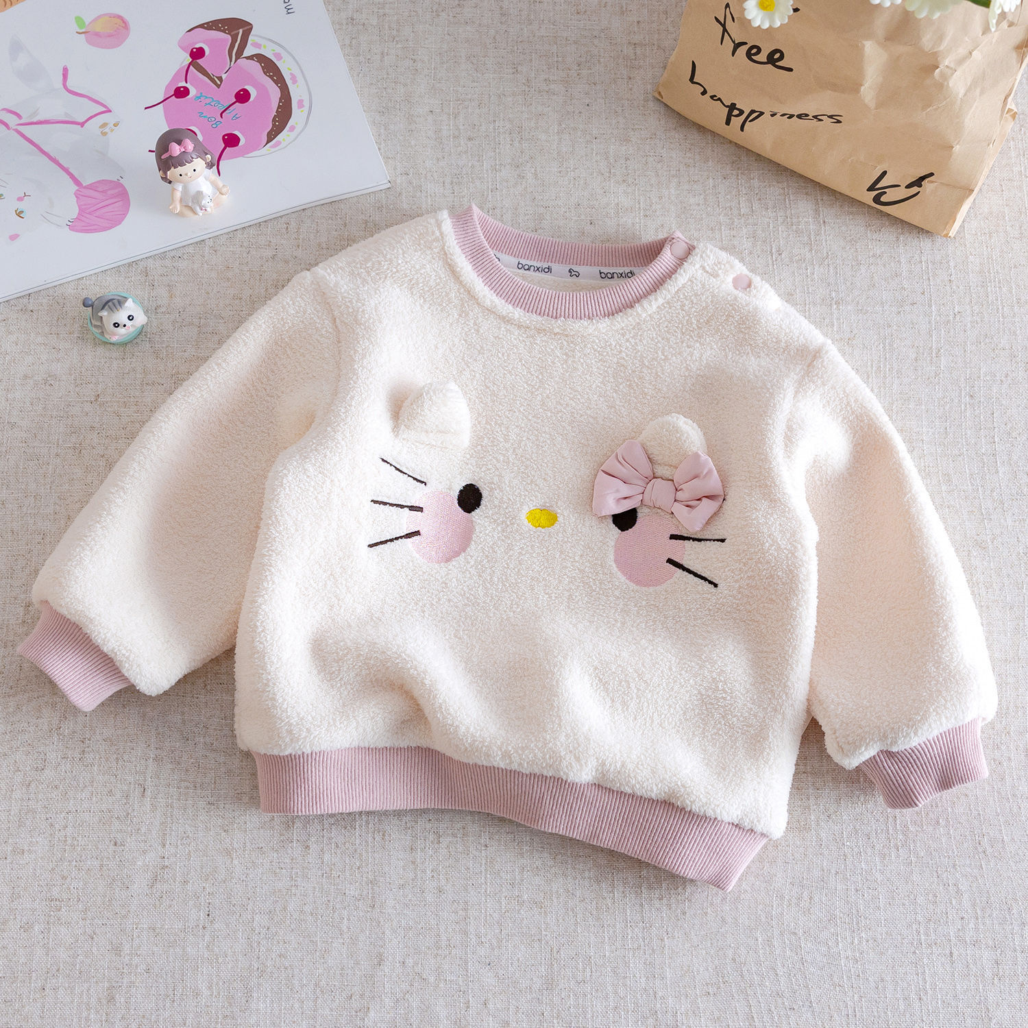 – Bluziță – extrem de moale și pufoasă, cu o textură călduroasă și o croială clasică. Accentul este pe adorabila pisicuță din față, cu urechiușe 3D, detalii fine brodate și o fundiță decorativă, care oferă un aspect delicat și jucăuș. Manșetele și tivul moi asigură o potrivire confortabilă.