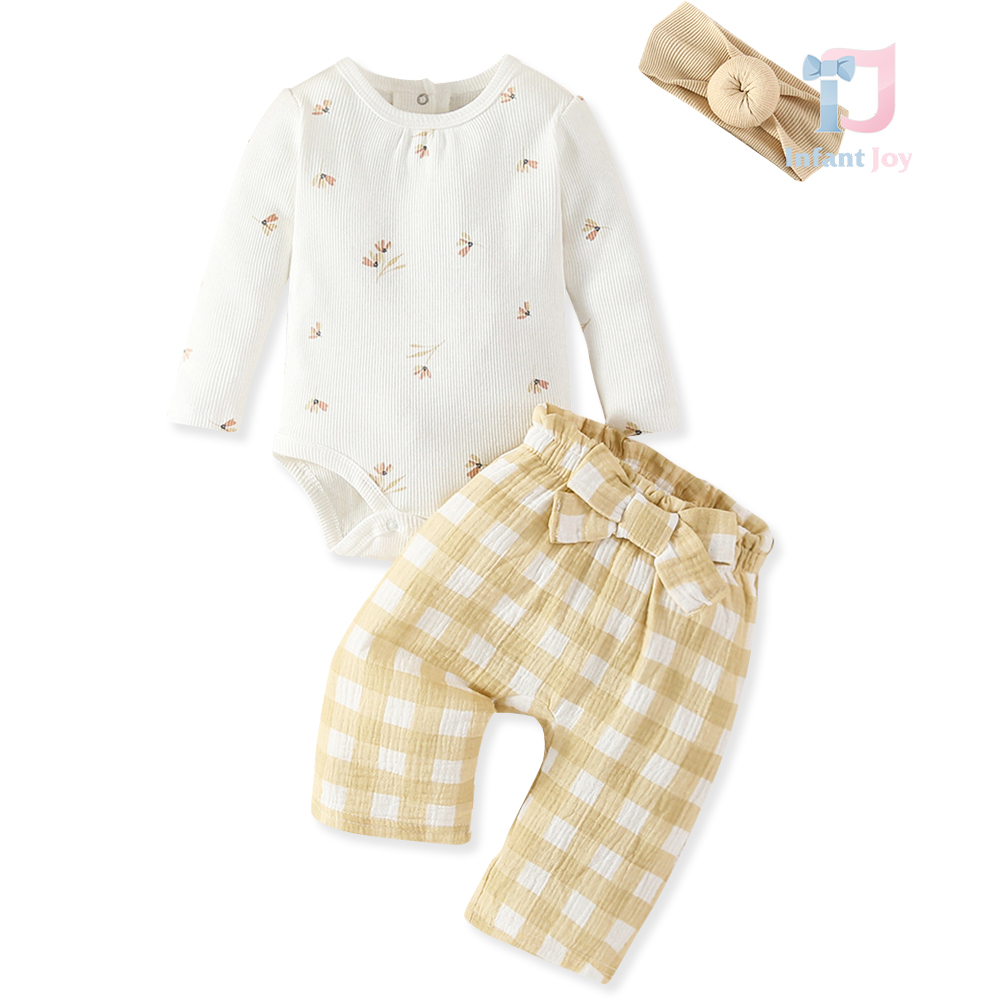 Set de 3 piese din body, pantaloni din muselină și bentiță pentru cap Beige Flowers
