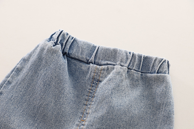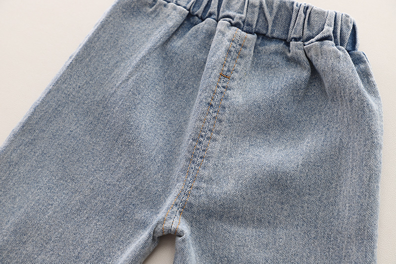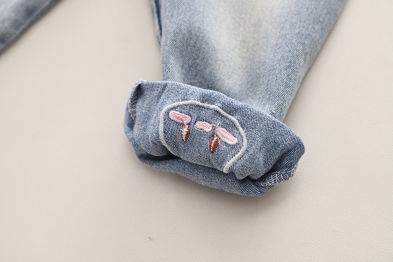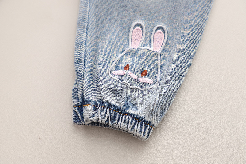 -Pantaloni din denim comozi, cu elastic în talie și la glezne pentru confort, decorați cu zone decolorate + două broderii cu iepurași pe craci.
