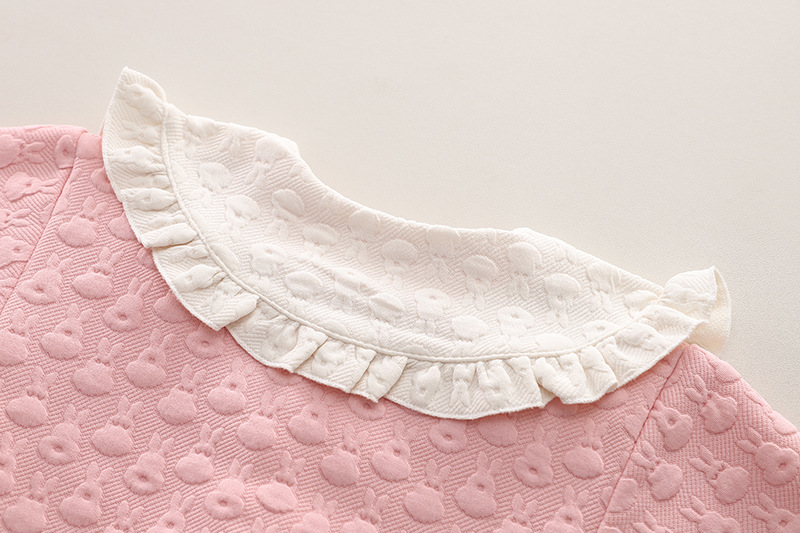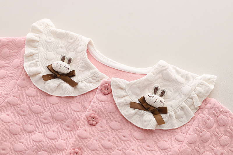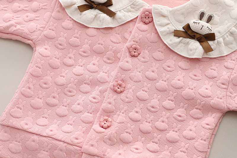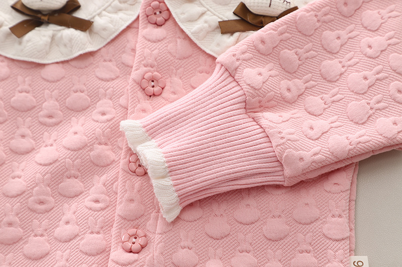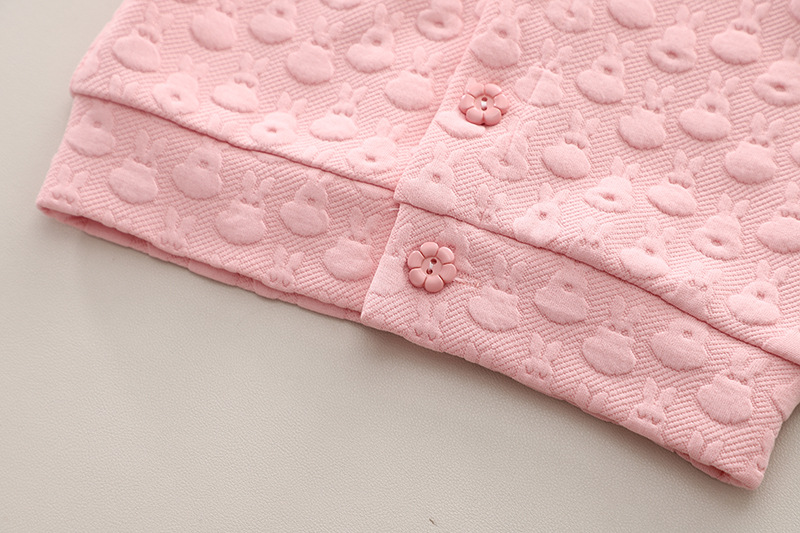 -Jachetă/hanorac tip bomber, realizată din material de înaltă calitate, cu model în relief cu iepurași mici, în nuanță roz. Model cu guler tip „Peter Pan“, decorat cu volănașe + elemente 3D. Se închide cu nasturi pentru îmbrăcare ușoară.