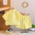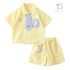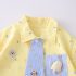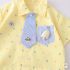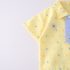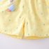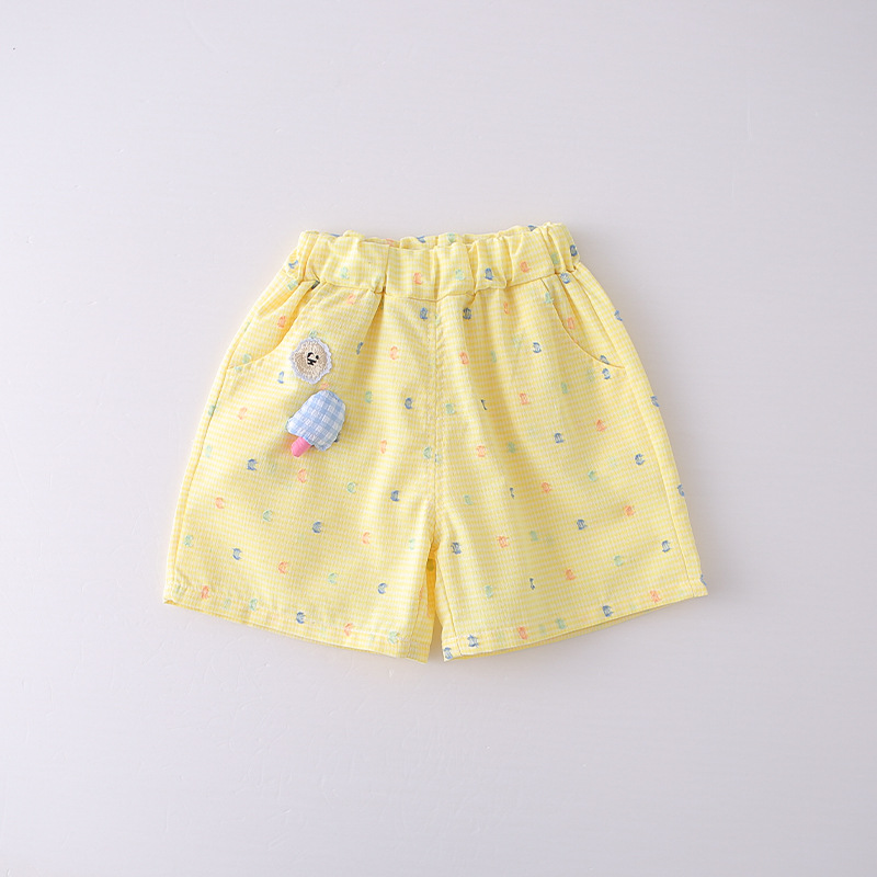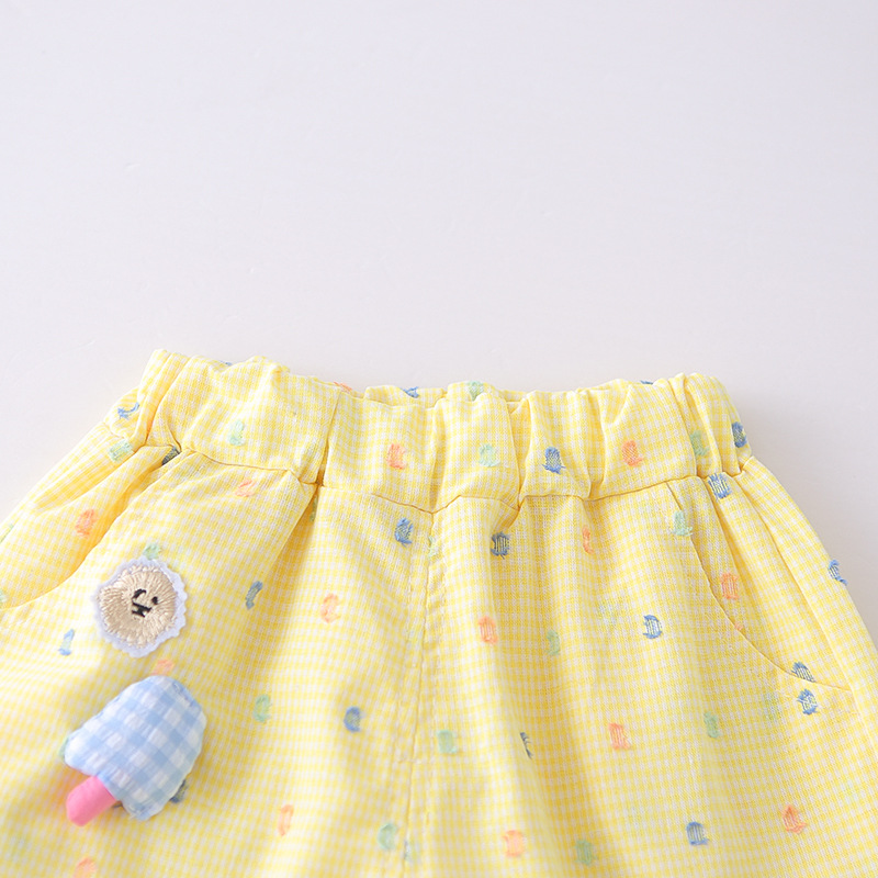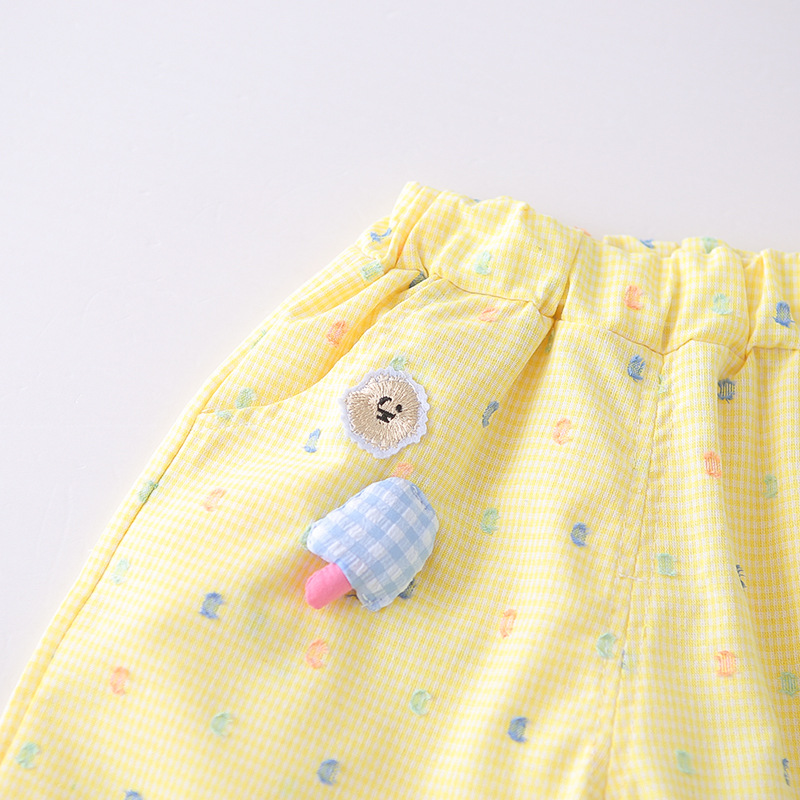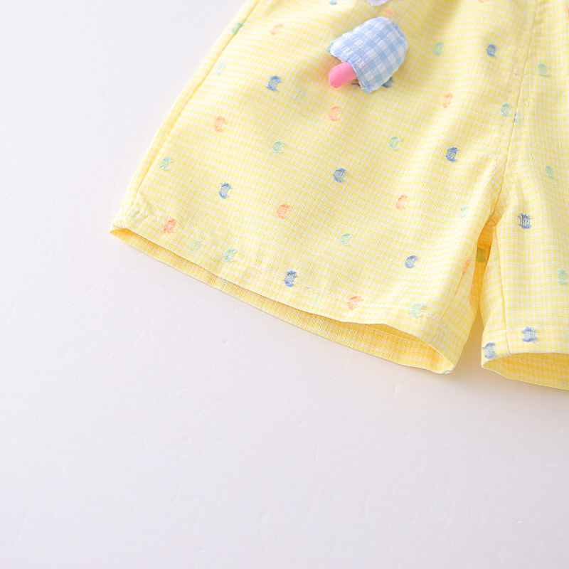– Pantaloni scurți în același model galben, realizați dintr-o țesătură moale și confortabilă. În partea din față au, din nou, un element 3D adăugat și o broderie simpatică. Modelul are talie elastică pentru îmbrăcare ușoară și libertate de mișcare. Croiala este lejeră și comodă pentru joacă și plimbări.