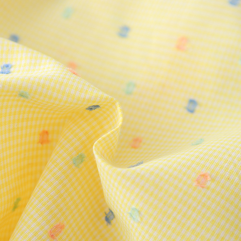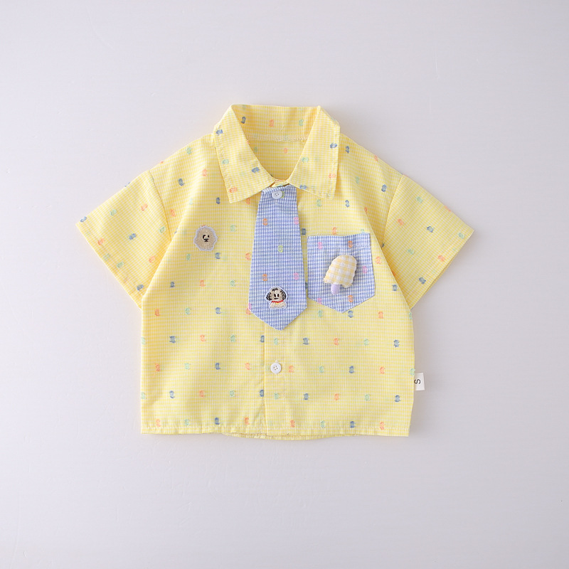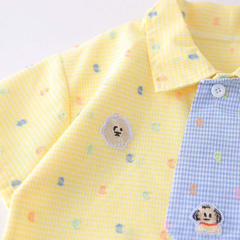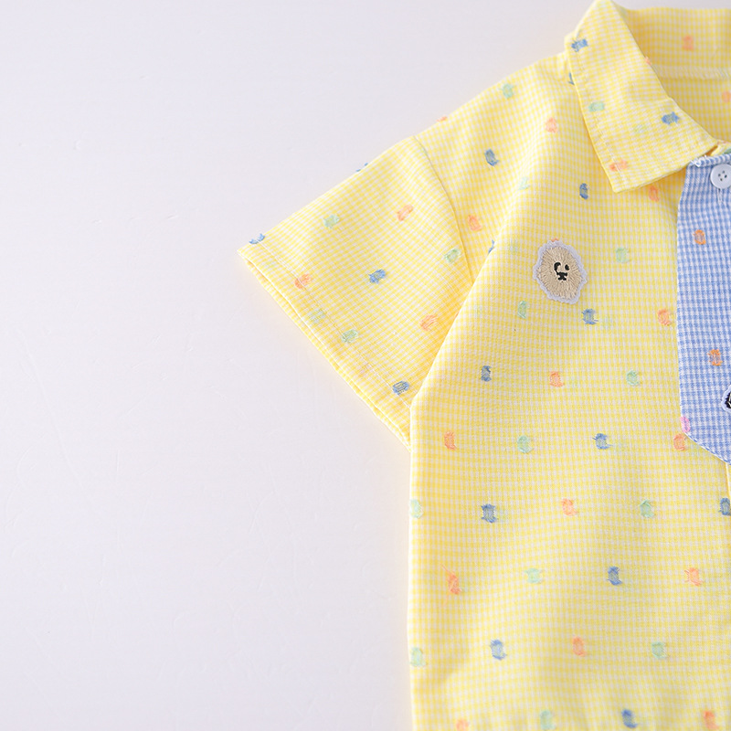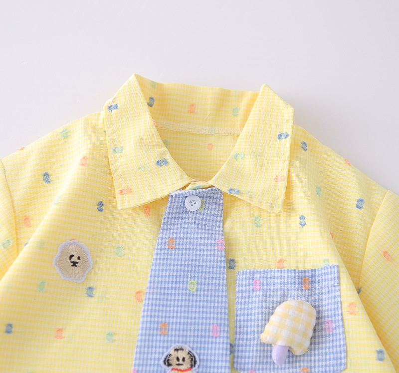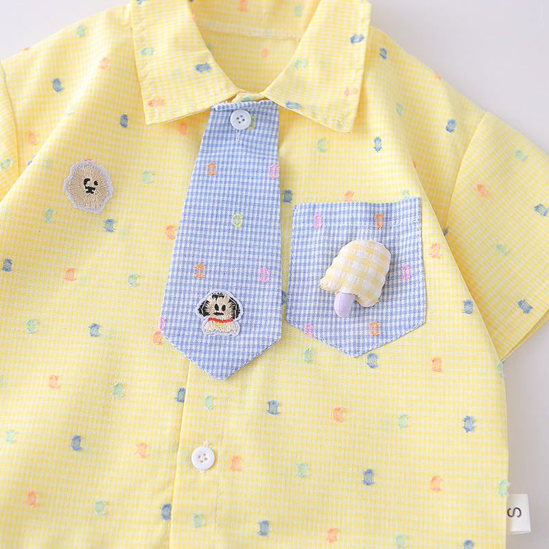 – Cămașă cu mânecă scurtă, confecționată dintr-un material ușor și respirabil din bumbac, într-o nuanță intensă de galben, cu un model discret în carouri și mici accente colorate. Modelul are guler clasic și se închide cu nasturi în față. În partea din față are un buzunărel cu un element 3D (o mică aplicație), precum și detalii brodate drăguțe care completează aspectul. Croiala este confortabilă și potrivită pentru zilele călduroase.