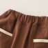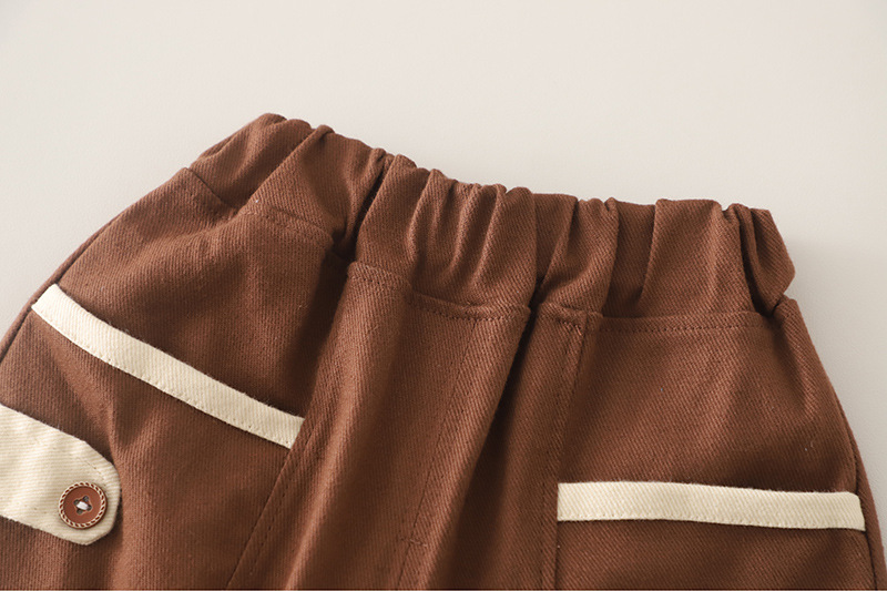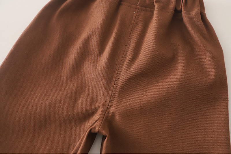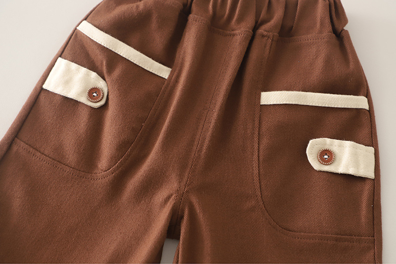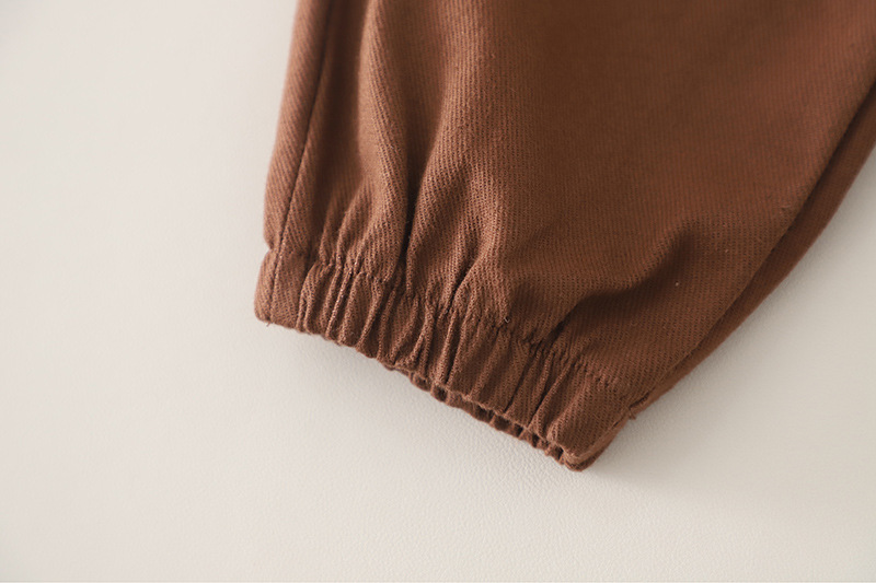 – Pantaloni – model confortabil, într-o nuanță caldă de maro, cu croială lejeră, talie elastică și manșete elastice la glezne. Cele două buzunare cu nasture adaugă un accent funcțional și stilat.