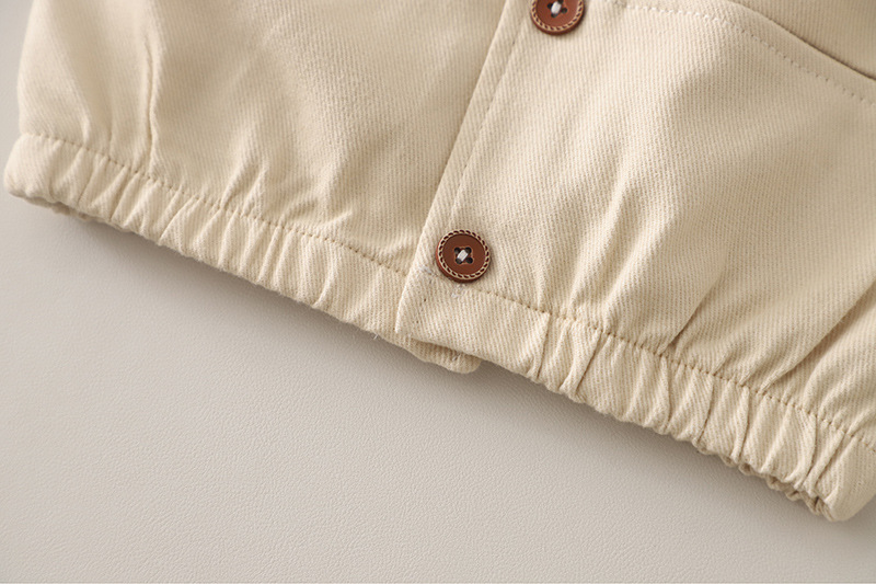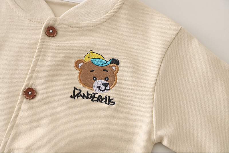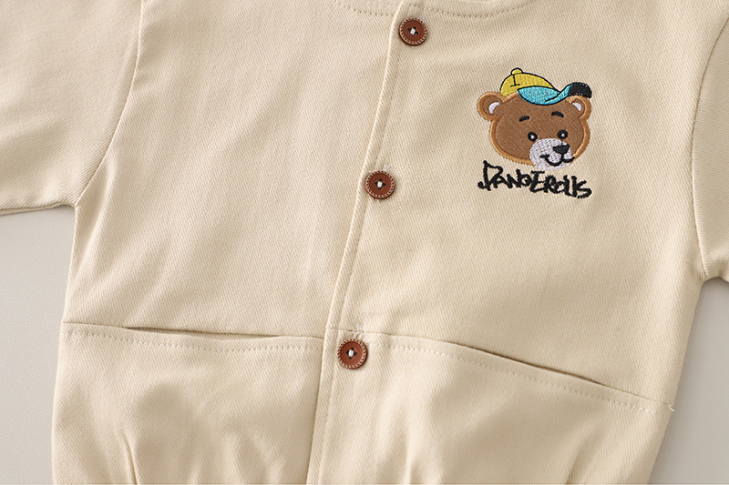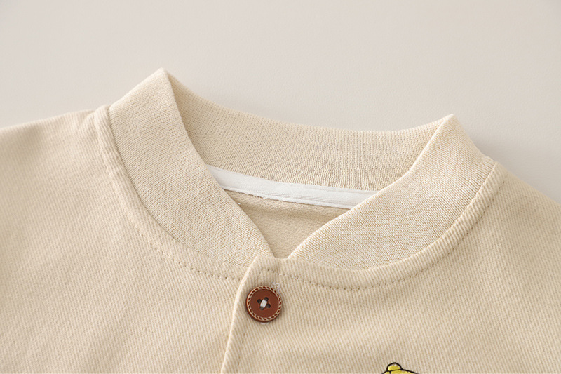 – Jachetă / bomber – model stilat, într-o nuanță delicată de crem, cu croială clasică și închidere cu nasturi. Accentul este pus pe aplicația drăgălașă cu ursuleț din față, care oferă un aer jucăuș și copilăresc. Manșetele moi asigură o potrivire excelentă și confort sporit. Două buzunare frontale pentru păstrarea micilor comori.