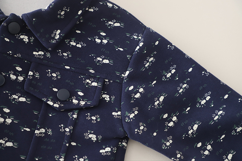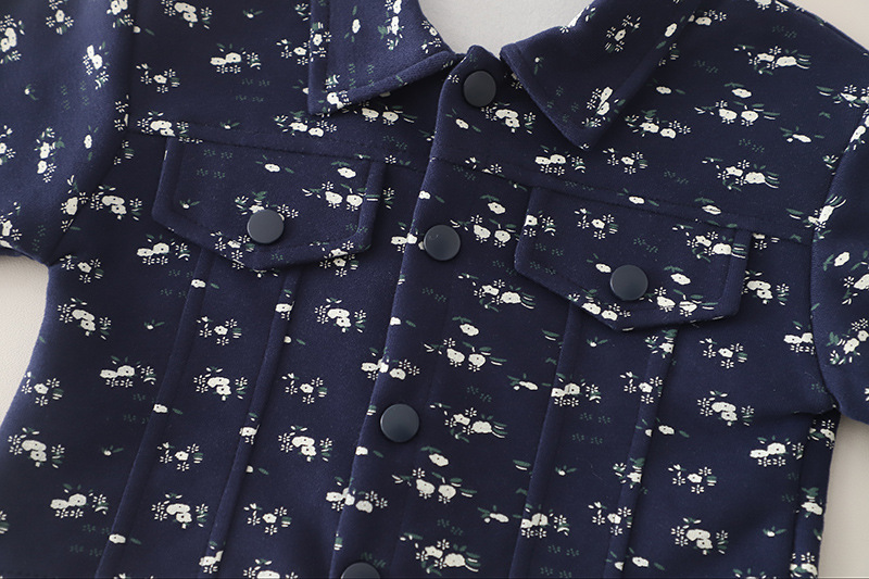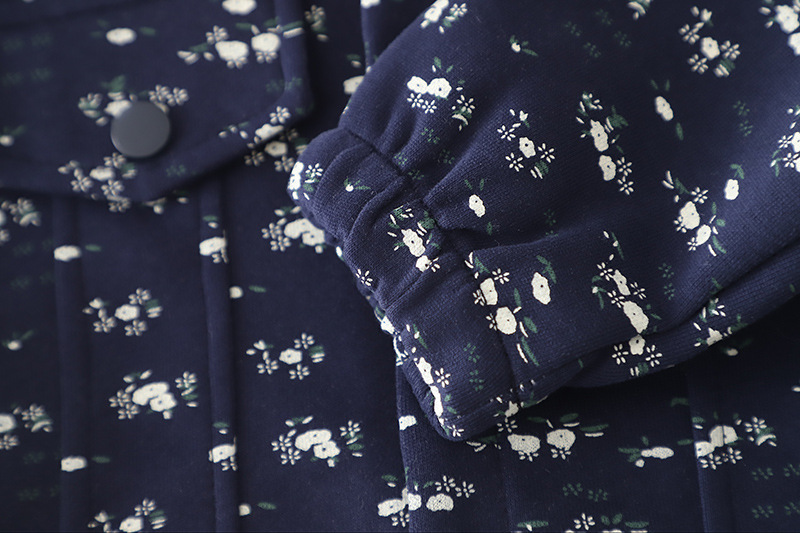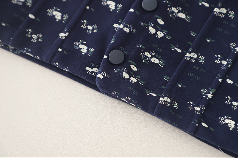 – Geacă / bomber cu guler clasic – model modern în culoare bleumarin, cu un fin imprimeu floral, care adaugă un accent proaspăt și actual. Închiderea cu nasturi, buzunarele funcționale și croiala lejeră asigură confort și practicitate la purtare.