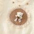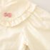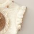 – Vestă cu volănașe, confecționată din tricotaj de înaltă calitate, într-o nuanță deschisă de crem. Accentul este aplicația 3D cu ursuleț, amplasată într-un cerc decorativ cu margine din dantelă și completată cu o mică fundiță. Volănașele de pe umeri și din partea de jos oferă o notă romantică și rafinată.
