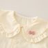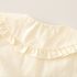 – Bluză cu mânecă lungă și guler tip Peter Pan, realizată din material de bumbac, într-o culoare crem delicată. Modelul are un guler rotunjit, decorat cu volănașe, închidere fină în față și mâneci ușor bufante, terminate cu volănașe delicate la manșete, care conferă un aspect extrem de gingaș și feminin.