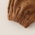 – Pantalon din denim, de culoare maro, cu talie elastică, tivuri cu elastic și model decorativ cu puncte mici, care se armonizează perfect cu partea superioară și completează ținuta într-un mod elegant și echilibrat.