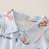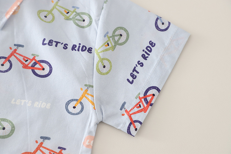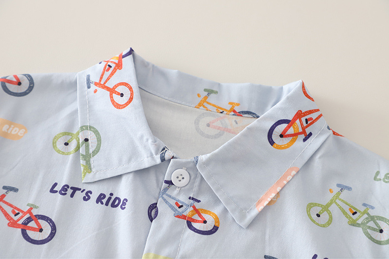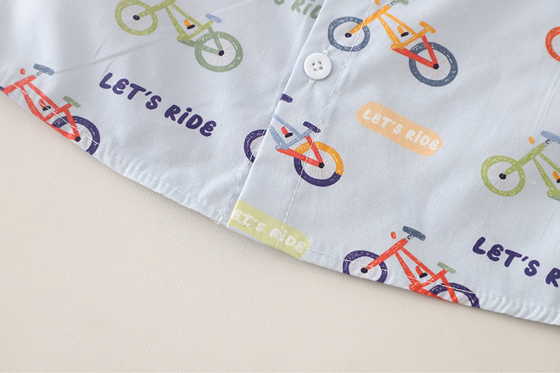 – Cămașă cu mânecă scurtă într-o nuanță deschisă, confecționată dintr-un material de bumbac ușor și respirabil, decorată cu imprimeuri colorate cu biciclete și inscripții – un accent jucăuș și modern pentru un aspect proaspăt. Modelul are guler clasic și închidere cu nasturi pe toată lungimea.