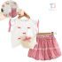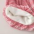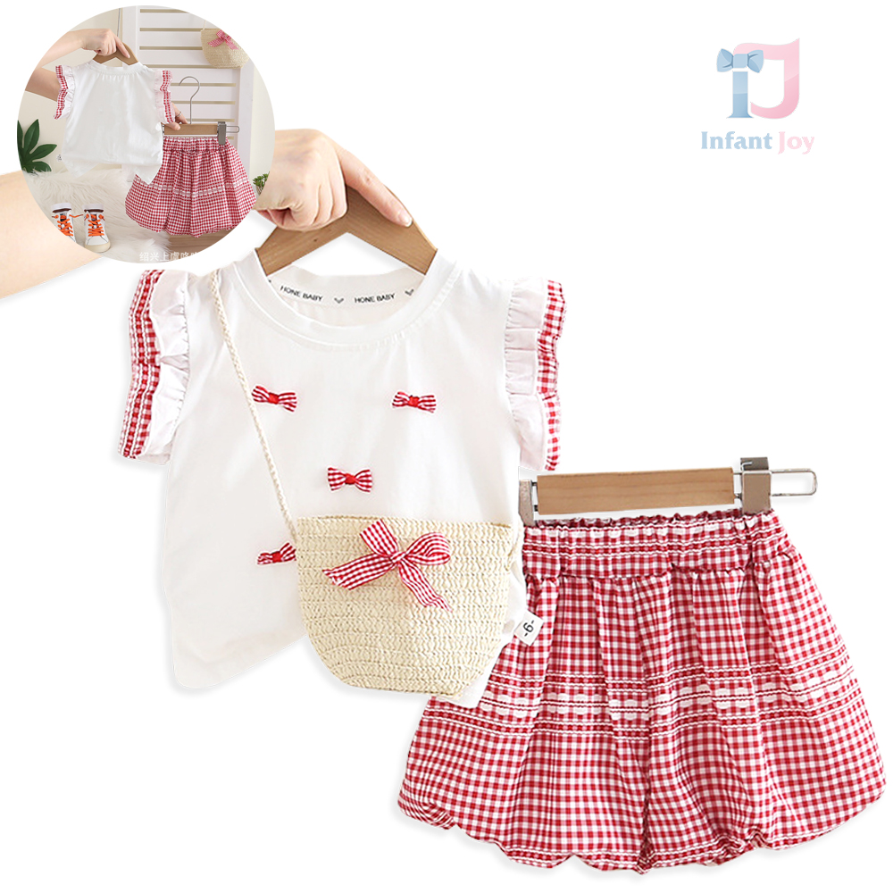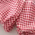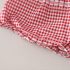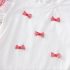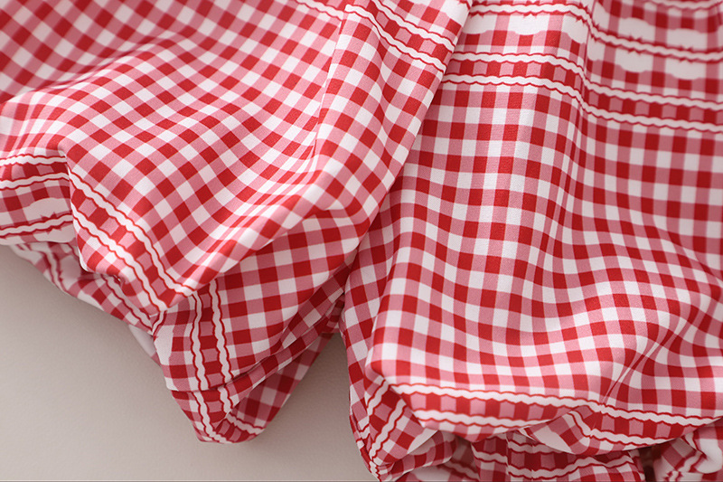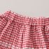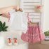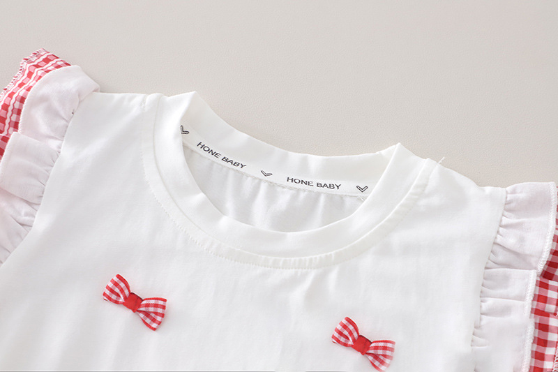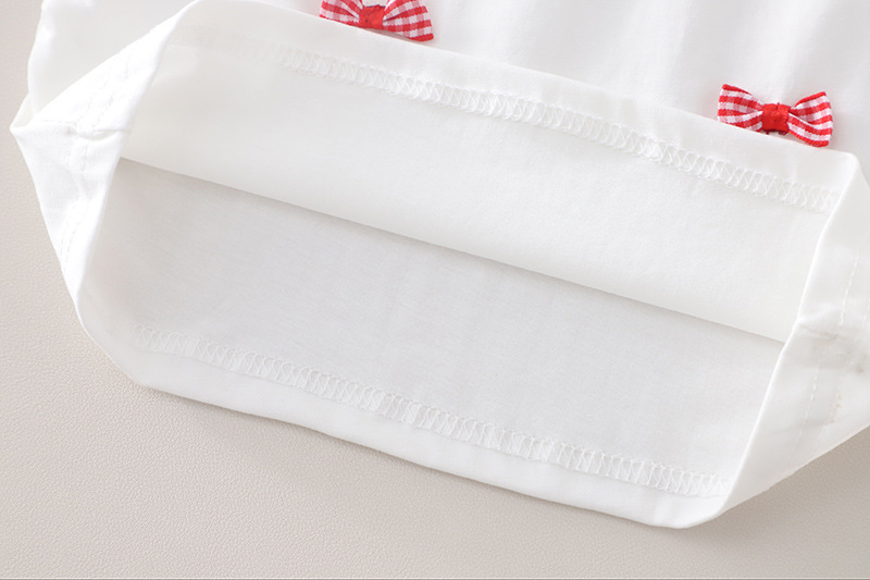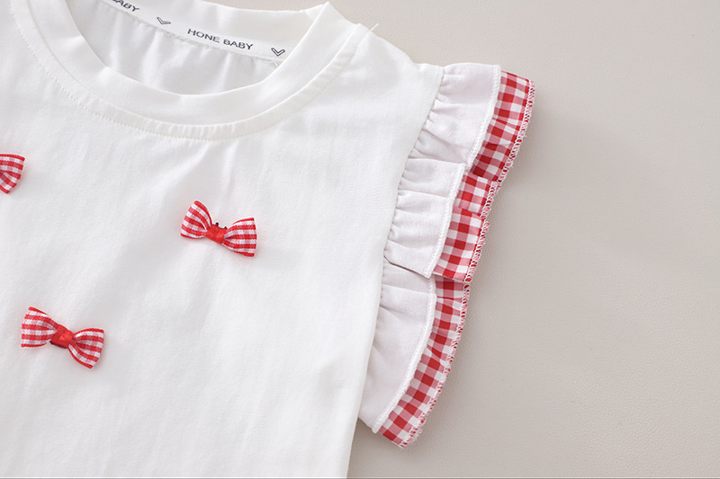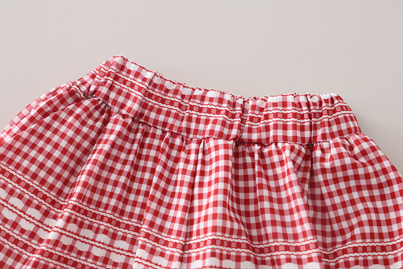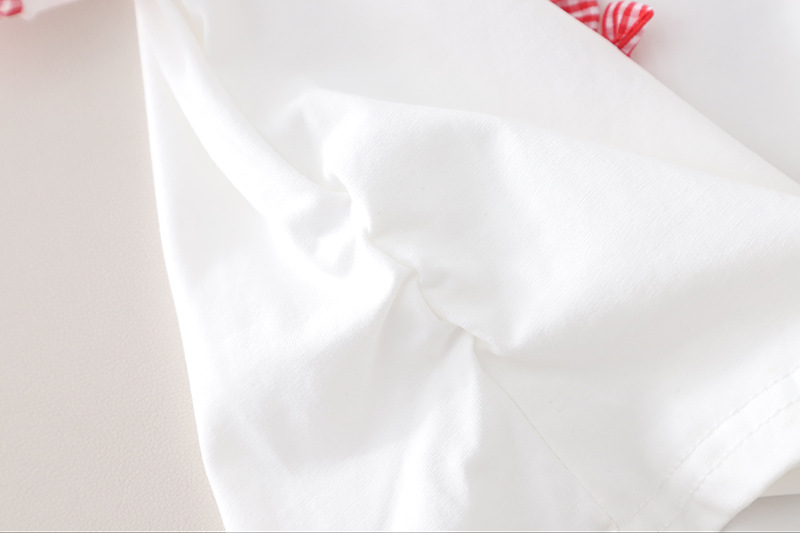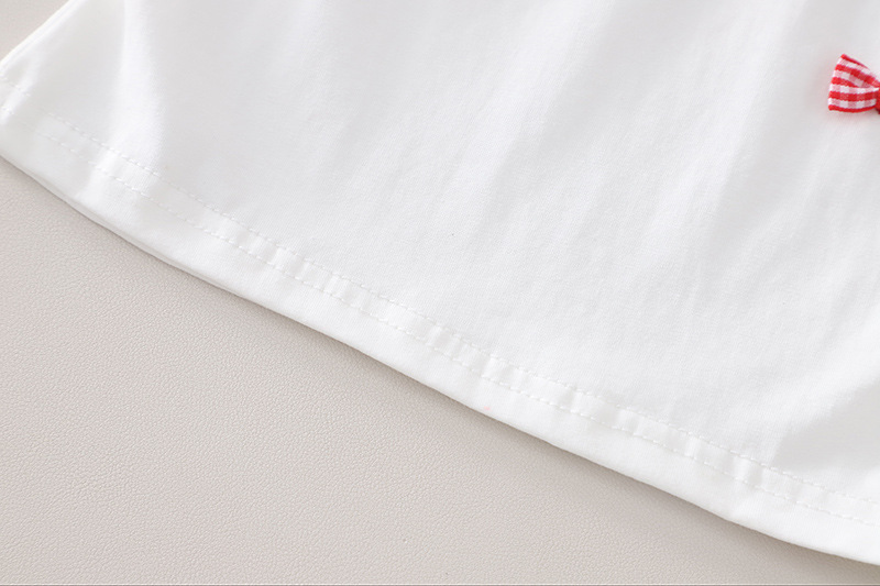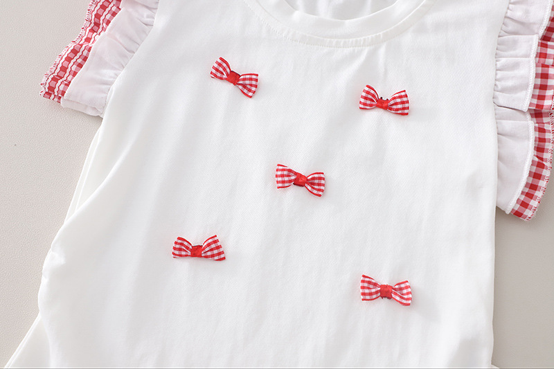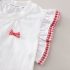 – Top alb, confecționat din material moale. Mânecuțele au volănașe și tiv în carouri roșii-albe, iar în față sunt adăugate mici fundițe decorative 3D, care oferă un aspect delicat și jucăuș.