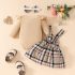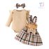 – Fustă scurtă, din material plăcut la atingere, cu un model în carouri, talie elastică cu fundiță aplicată și un ursuleț brodat + bretele reglabile cu nasturi.