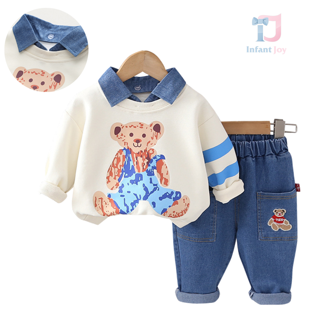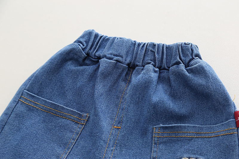 – Pantaloni din denim moale, cu croială dreaptă, talie elastică pentru confort, buzunare funcționale și o broderie simpatică cu ursuleț.
