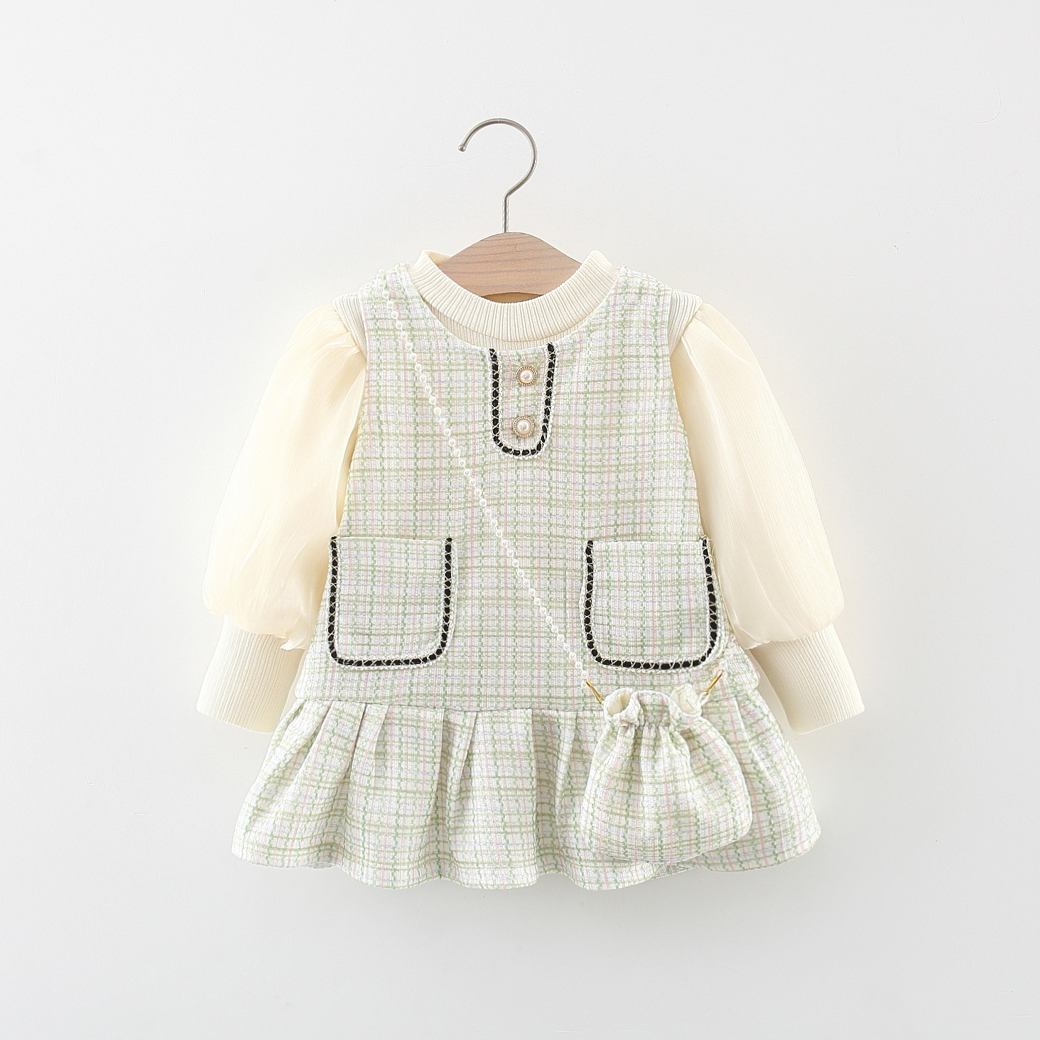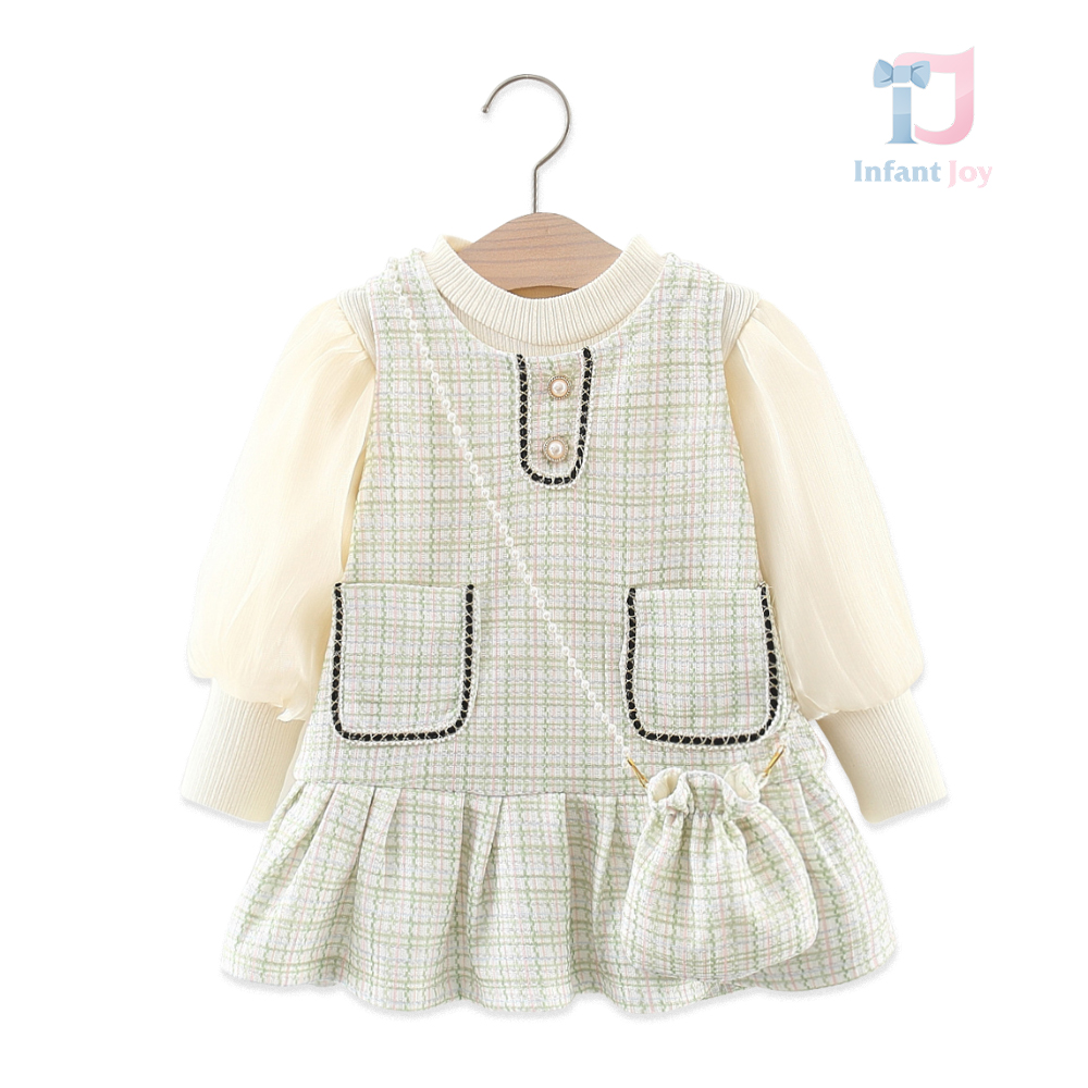 Set de 3 piese cu bluză din catifea și rochie Boucle cu geantă Stylish Miss Green