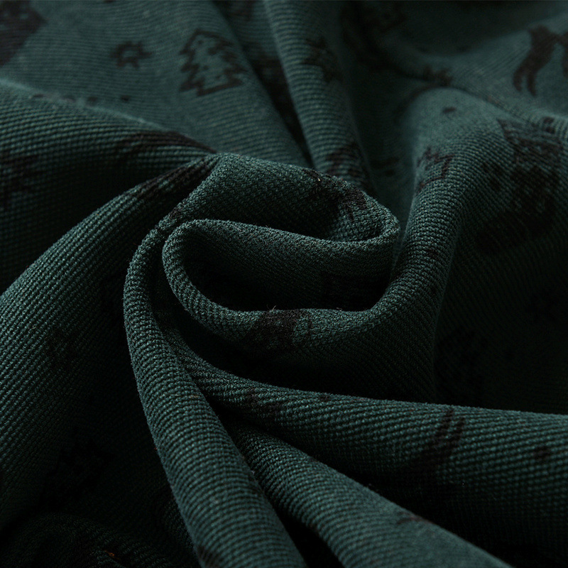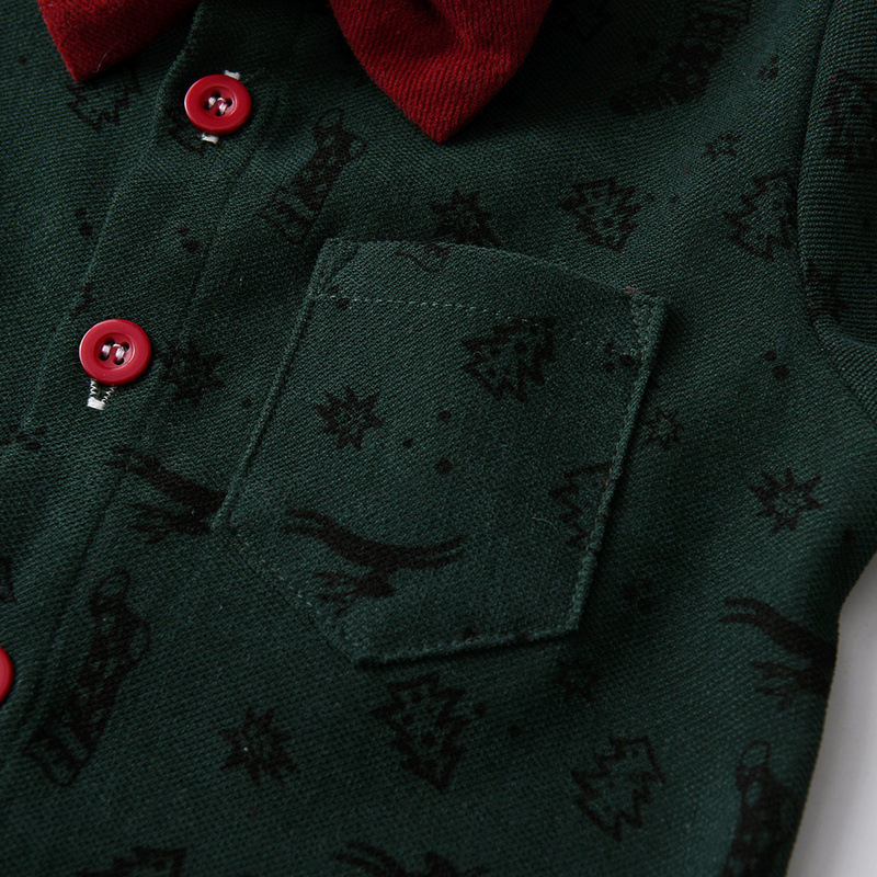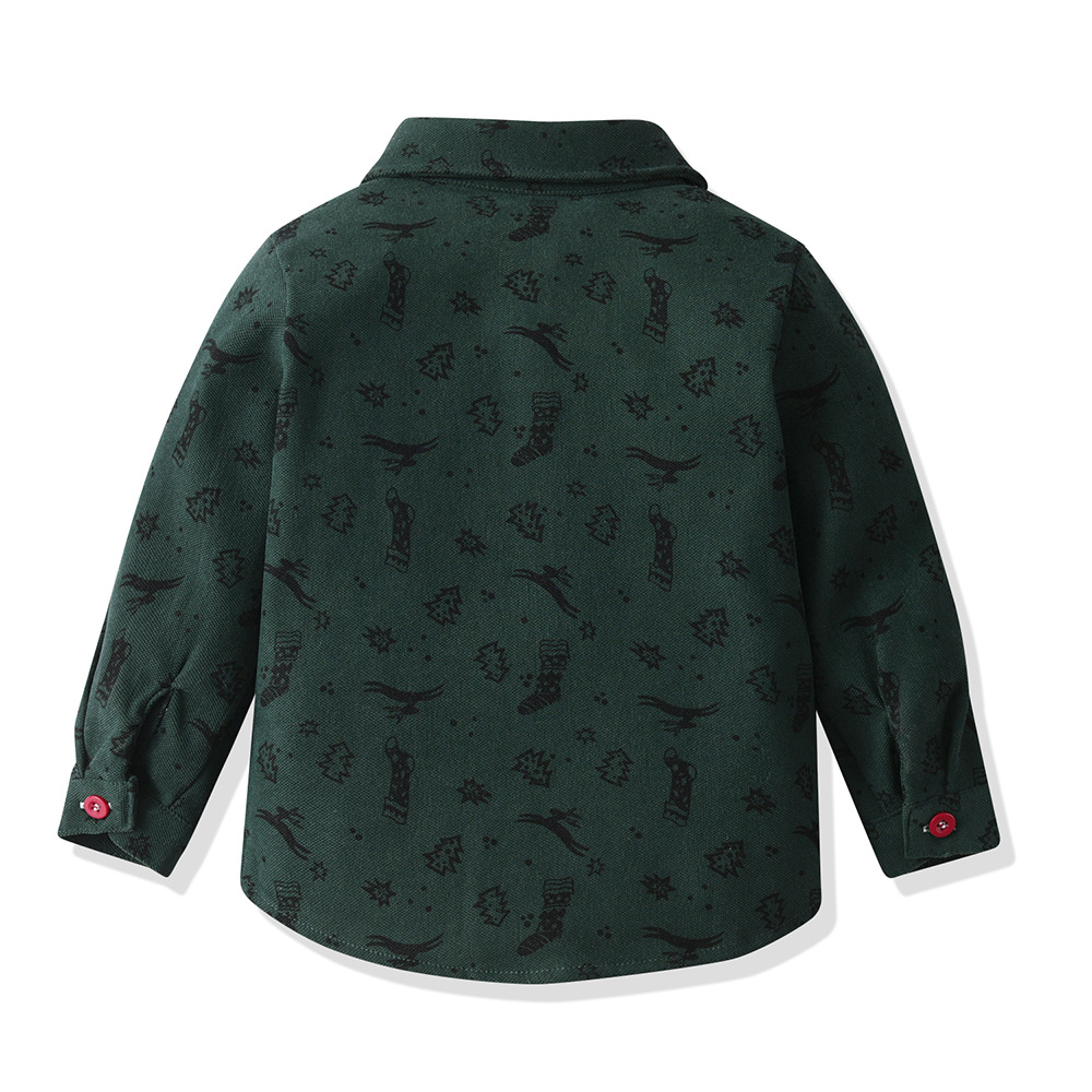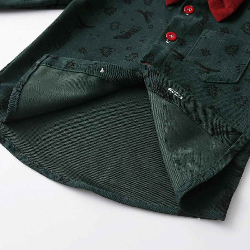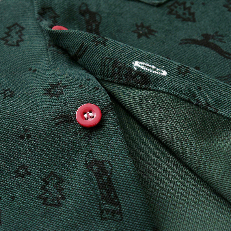 -O cămașă din material de bumbac de înaltă calitate, cu efect de catifea, de culoare verde, cu model de motive de Crăciun. Croială dreaptă, cu guler clasic, buzunar frontal cusut și închidere cu nasturi evidențiați pe toată lungimea, pentru un stil modern.