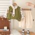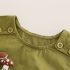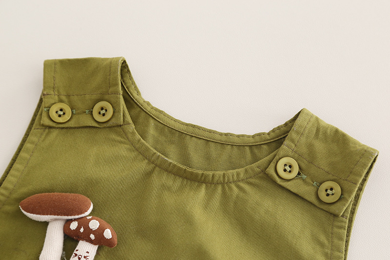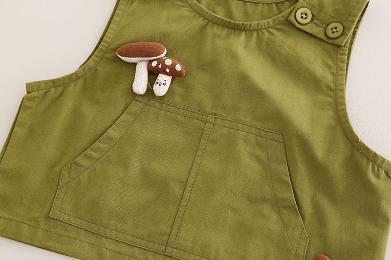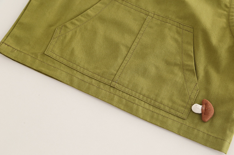 – Vestă din bumbac, în nuanță verde măsliniu. Decorată cu un buzunar mare tip „marsupiu” și ciupercuțe 3D aplicate – practică și cu un efect wow! Se închide cu nasturi la umeri, oferind un aer de mic cercetaș.