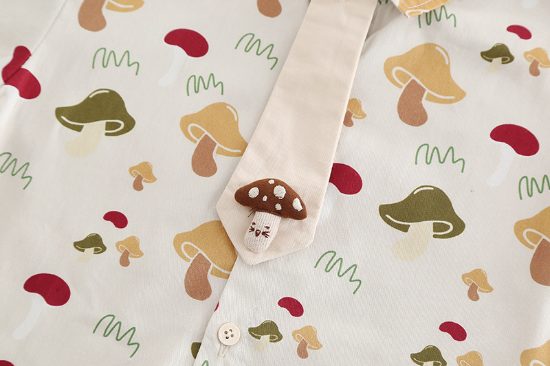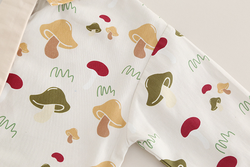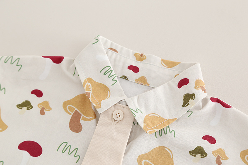 – Cămașă crem din bumbac, cu imprimeuri vesele cu ciupercuțe colorate. Model cu guler clasic și închidere frontală completă cu nasturi.