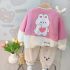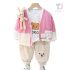 – Cardigan din tricotaj fin, realizat la mașină, într-o combinație de roz și crem. Model cu închidere prin nasturi, buzunar adăugat + un imprimeu mare pe spate reprezentând un iepuraș.
