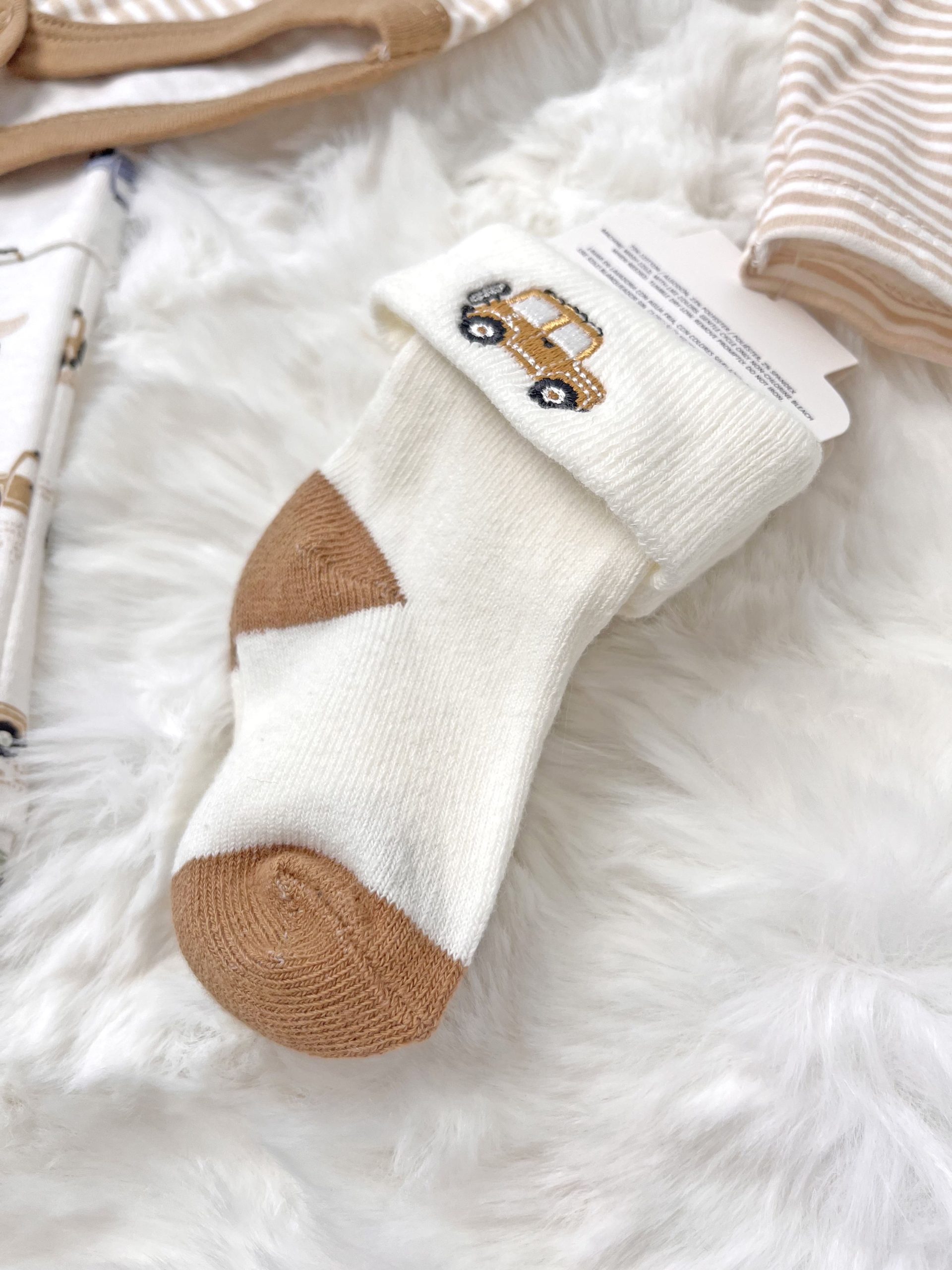 – Șosete într-o culoare delicată, cu accent contrastant – moi și potrivite pentru pielea sensibilă a bebelușului.