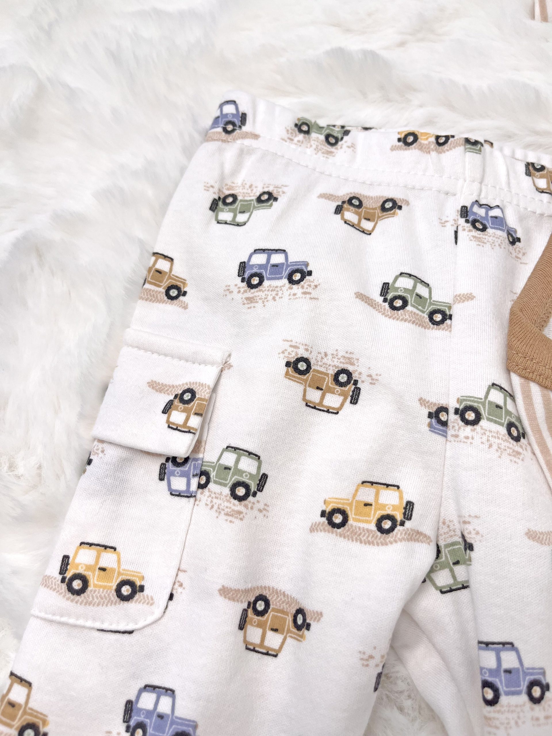 – Colanți într-o nuanță deschisă, cu imprimeu integral cu mici mașinuțe – un design jucăuș și amuzant care oferă personalitate setului. Confortabili și elastici, permit libertate de mișcare.