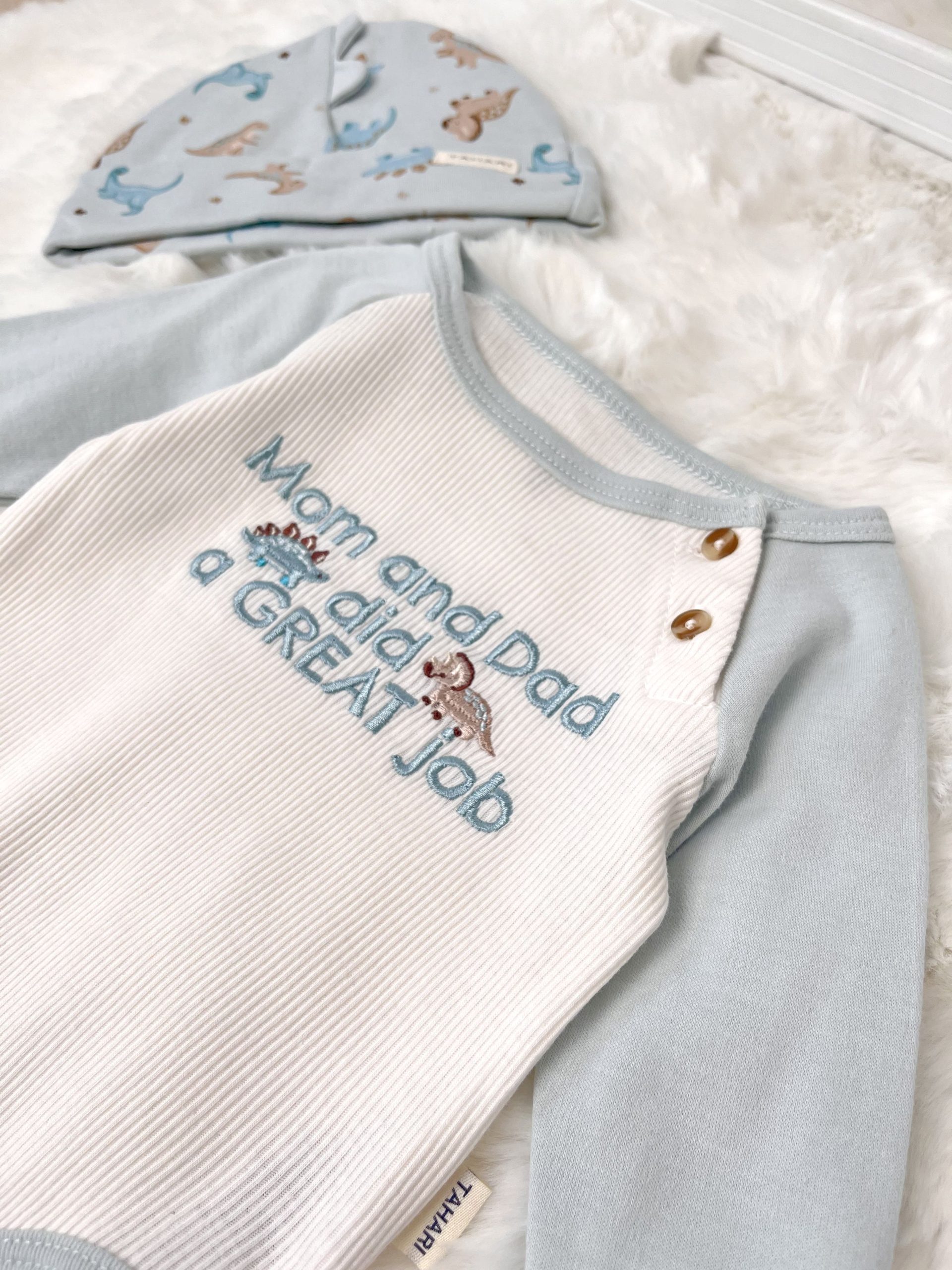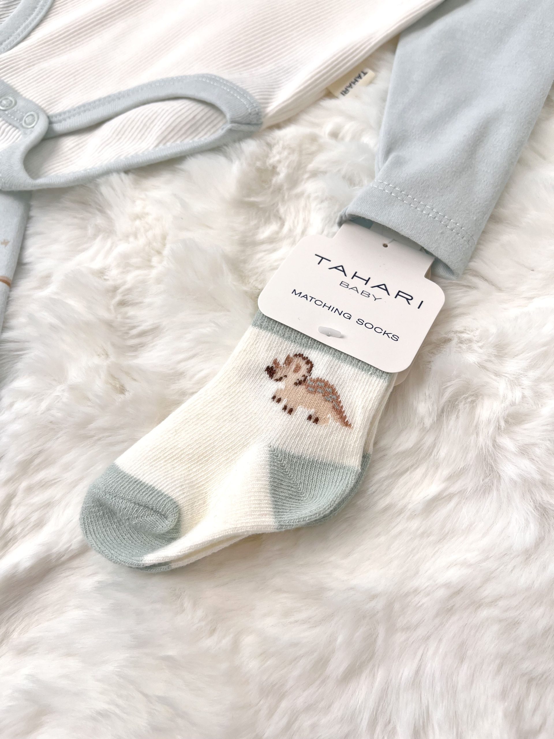 – Șosetuțe într-o nuanță delicată, cu un mic accent dinozaur – moi și potrivite pentru pielea sensibilă a bebelușului.